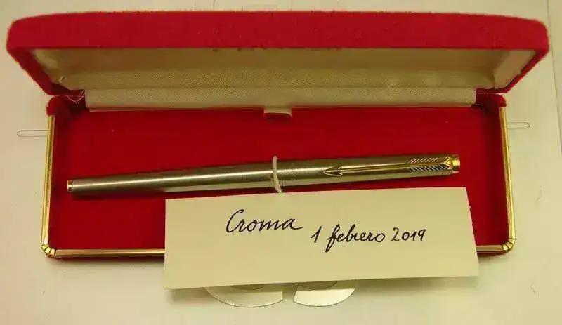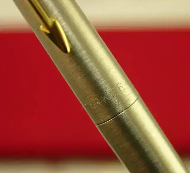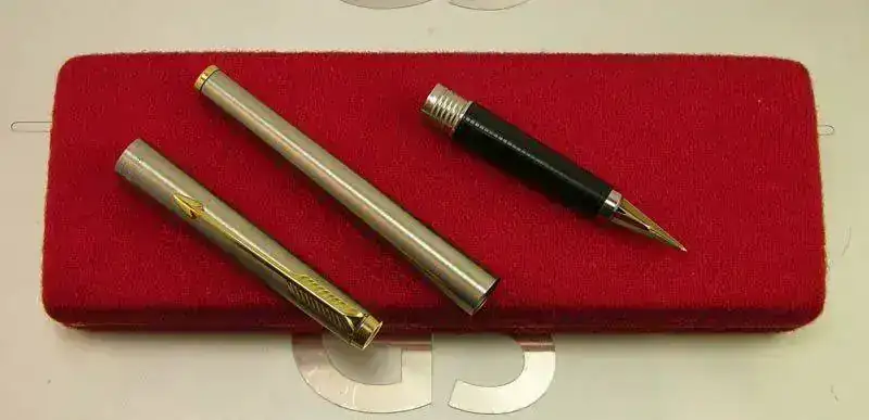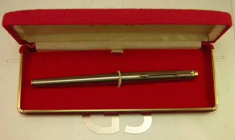 Ofrezco para su venta esta estilográfica PARKER 180 en acero con sección de agarre en resina negra y detalles chapados en oro.