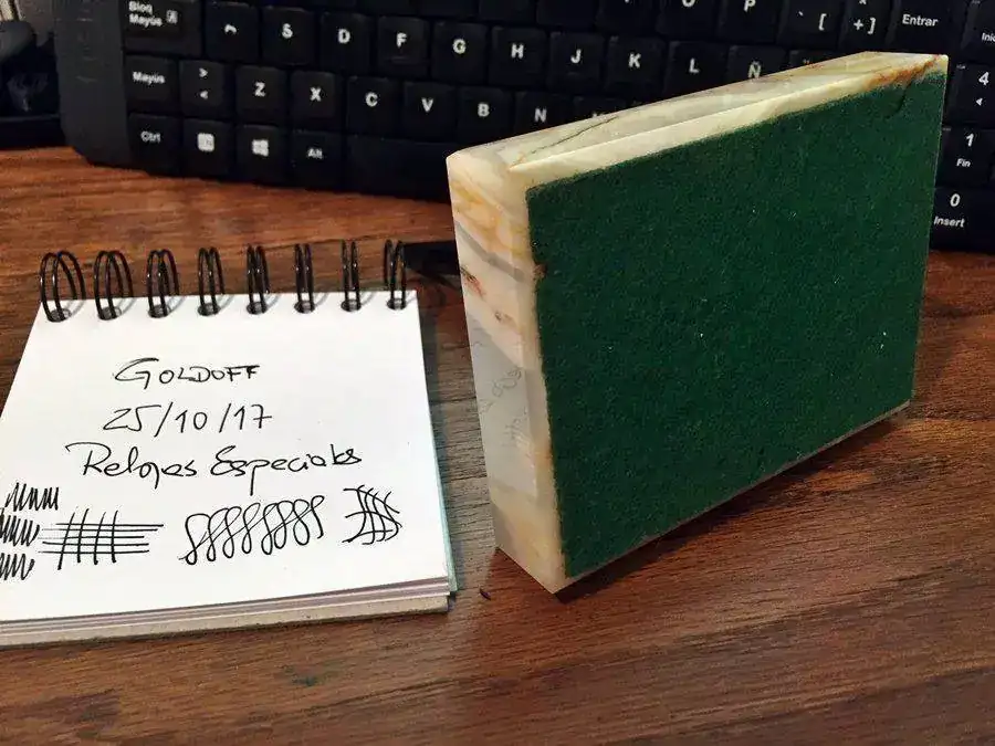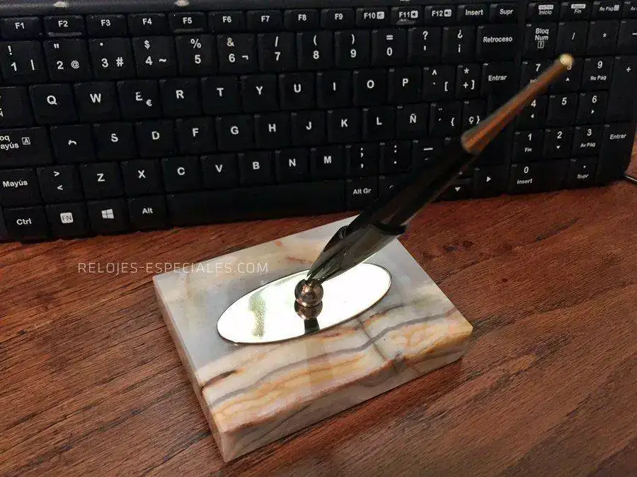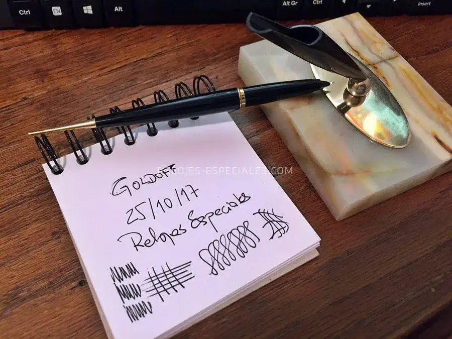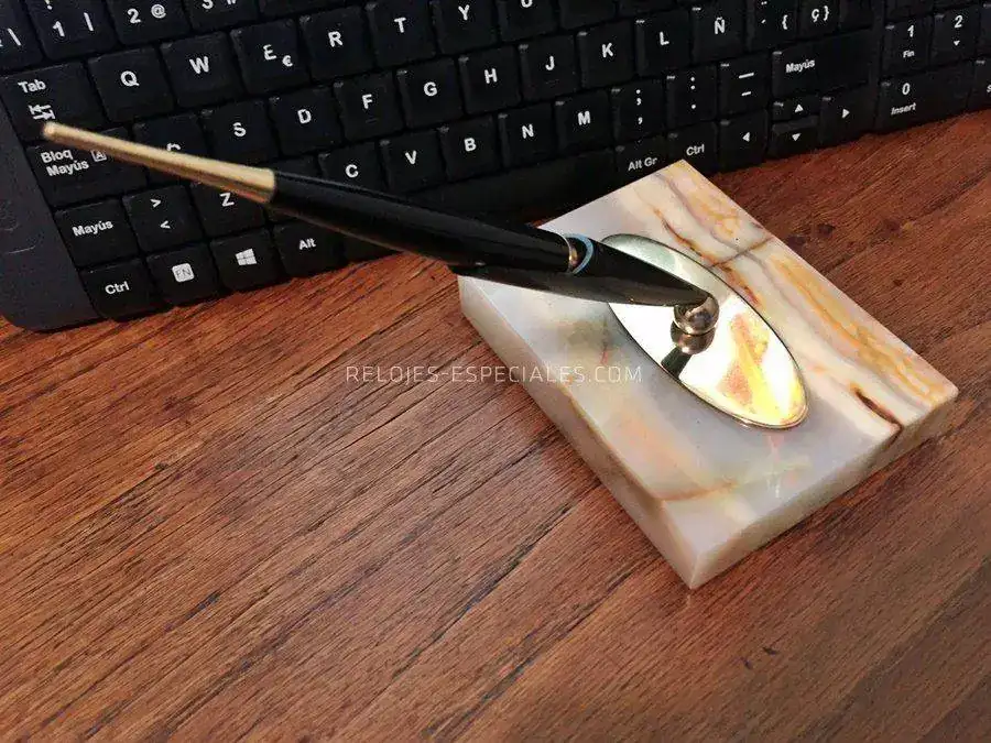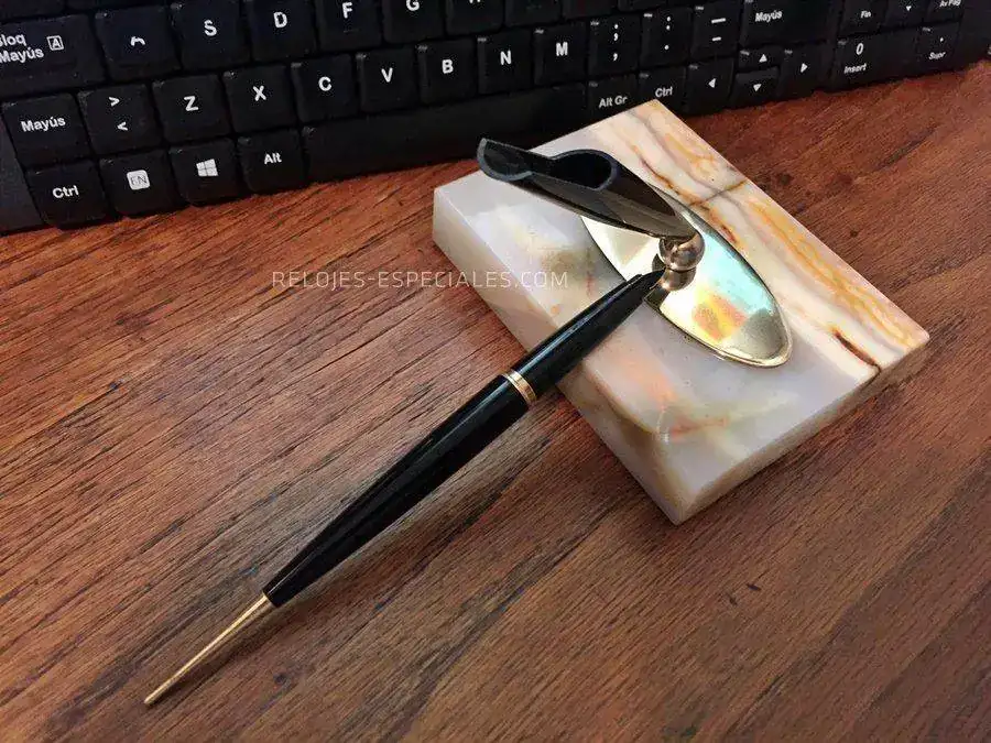 y lo hago para ofreceros una pequeña rareza -por infrecuente en el fcv- que empieza a juntar polvo en mi escritorio y a la que preferiría darle una mejor vida. Se trata de una Parker 45 de punto M justito (la nota está escrita con ella a modo palillero) con un fluir muy agradable y que carga por saco de succión. Va montada sobre una base de ágata a la que se une mediante una pletina de latón con centro magnético, lo que permite a la bola del soporte tomar cualquier posición. La base va forrado de fieltro verde, todo original de la época, cualquiera que esta fuera