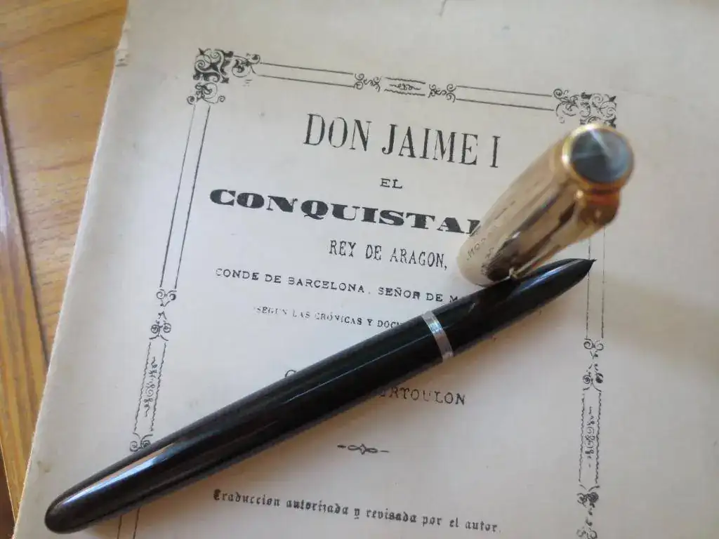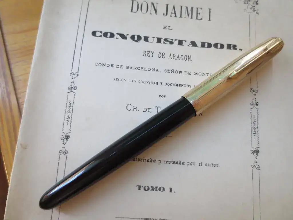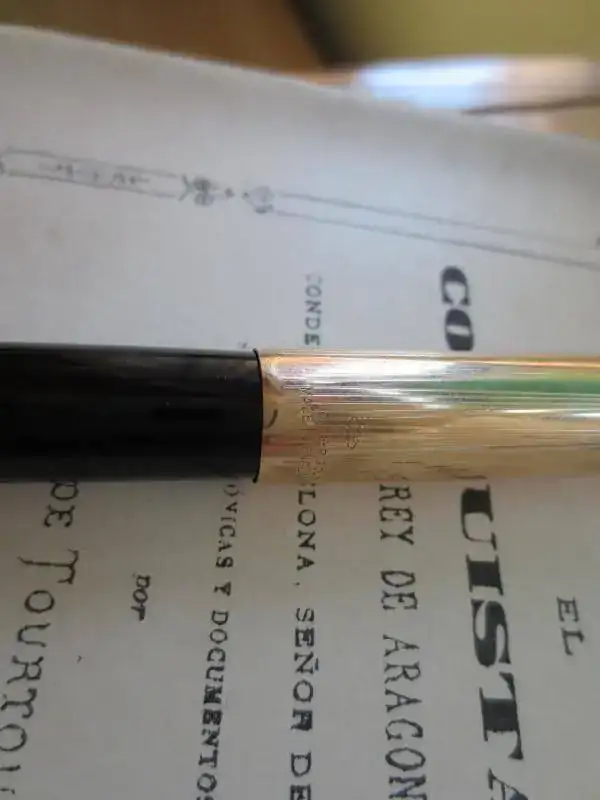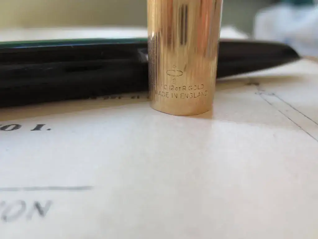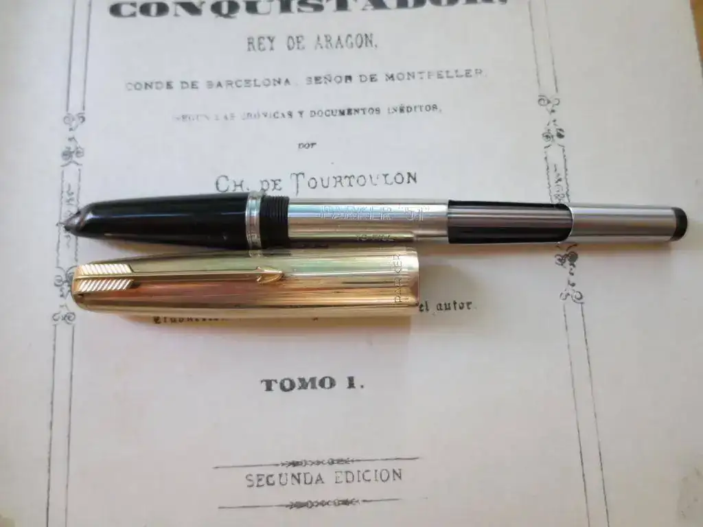 Vendola icónica Parker 51 England, aerométrica, con punto Fino de 14 Kt. En la última foto destaco, se puede ver si te fijas, un pequeño golpe en la parte baja del capuchón que no afecta en absoluto al cierre ni a la estética de la pluma, con señales de uso típicas, sin nada remarcable en el cuerpo, sin signos del desgaste del plaqué de oro del capuchón.