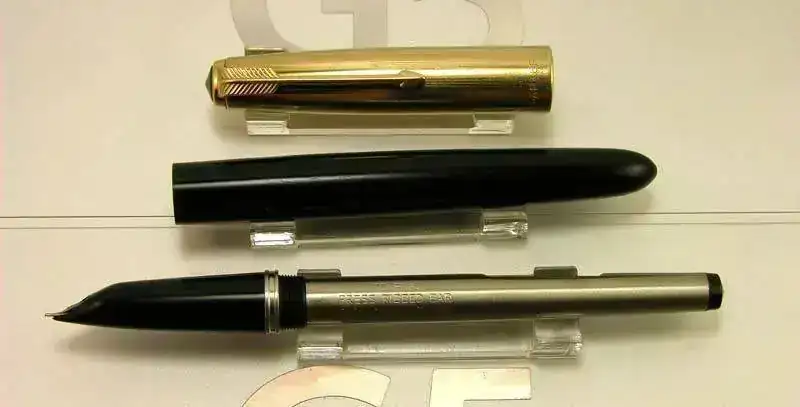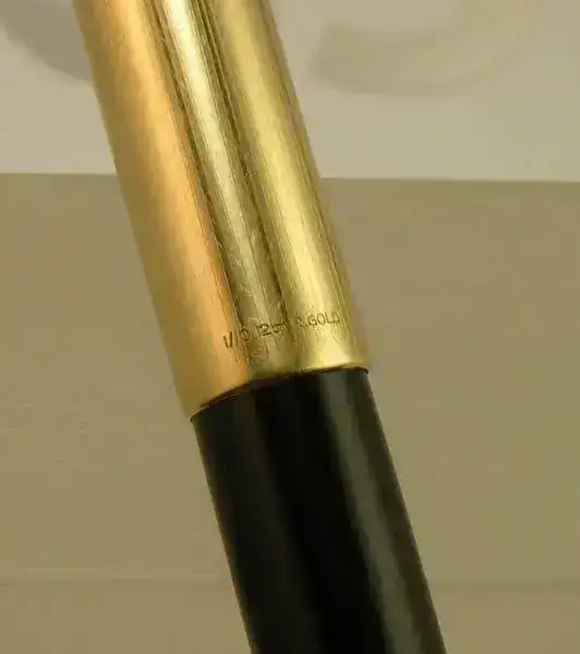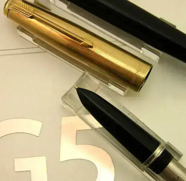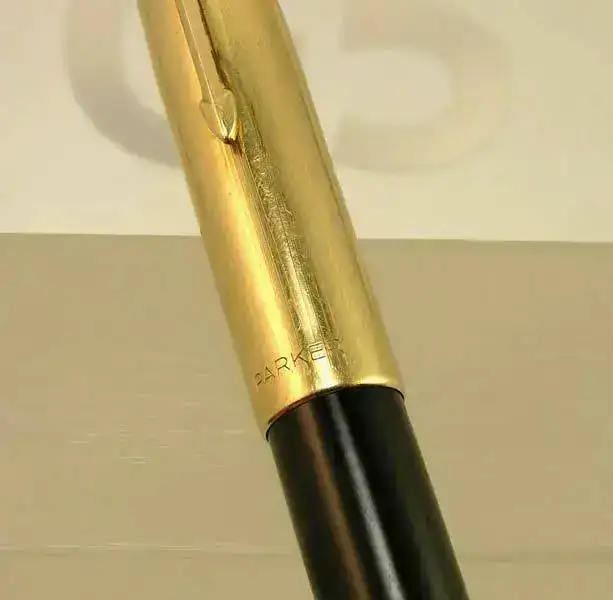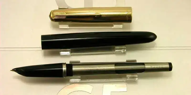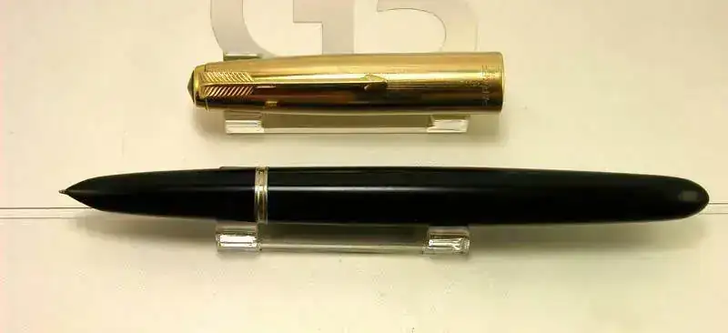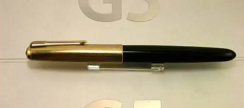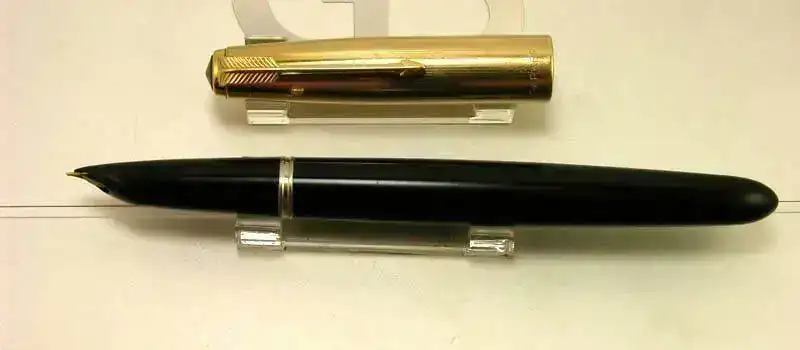Estilografica Parker modelo 51 aerometrica en color negro con capucha dorada y detalles dorados.