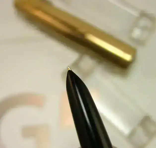 El estado es aceptable, con desgaste por uso normal, sin abolladuras, golpes ni fisuras en ninguna de sus partes. Carga y descarga tinta sin problema. Trazo fino con flujo contenido, adaptado al trazo. Plumin de oro de 14 kt con comportamiento rígido IR4.