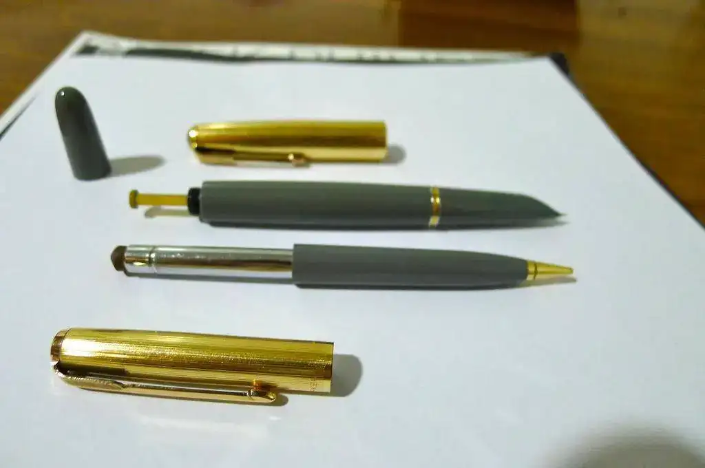 El lapicero está sin mina. Recuerdo que ésta era de las gruesas, posiblemente 1mm o más, y funciona por giro. (Lo que queda de goma de borrar es de las originales de Parker)