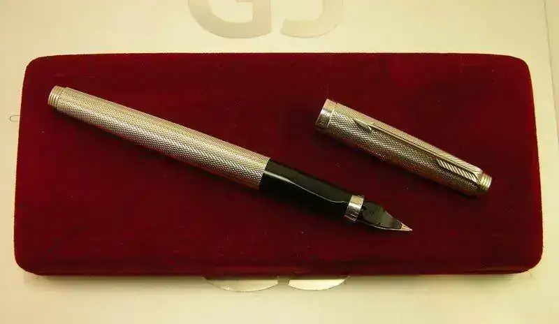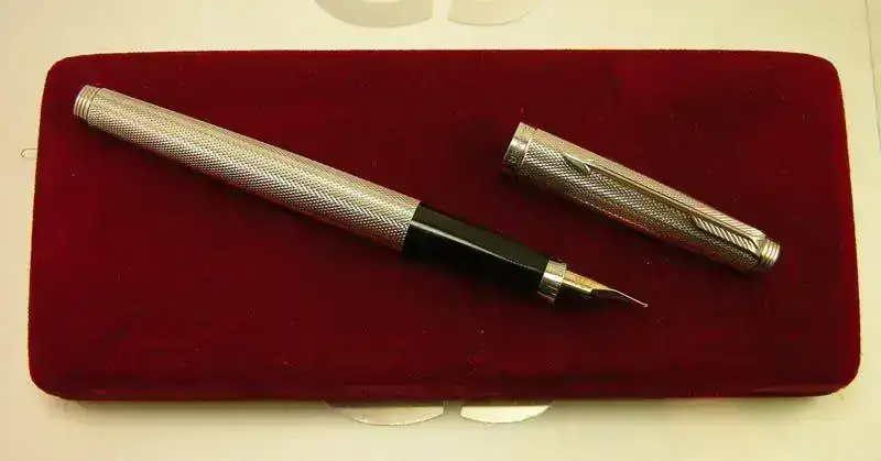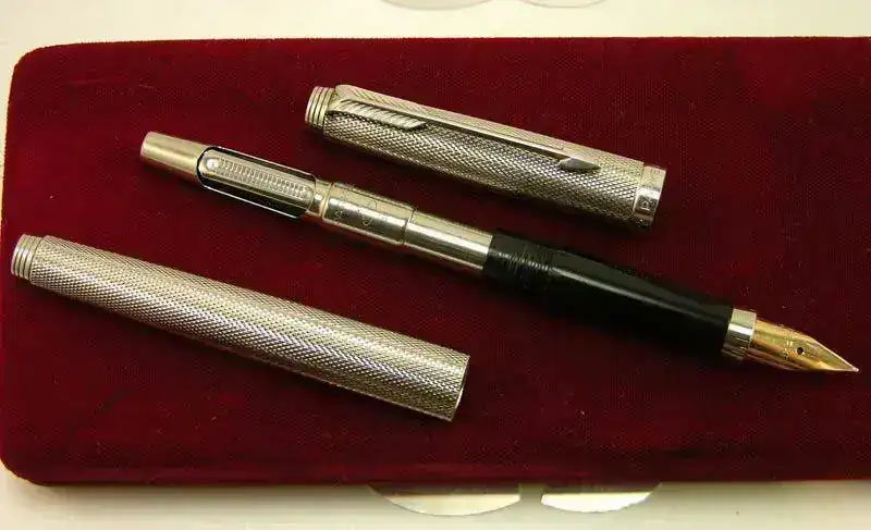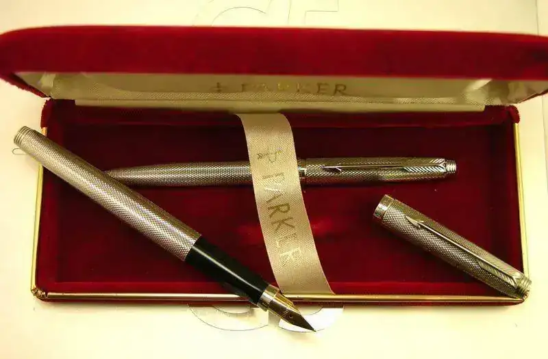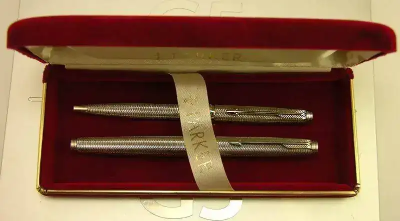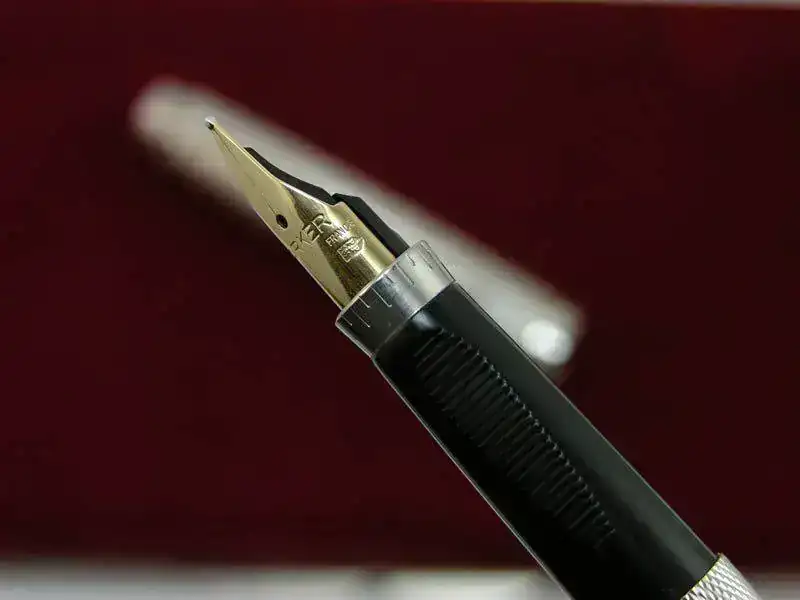 Ofrezco para su venta esta estilográfica PARKER 75 Place Vendôme chapado platino y sección de agarre en resina negra con bolígrafo tipo jotter a juego.