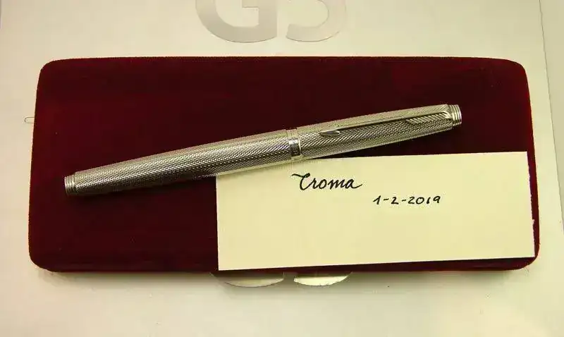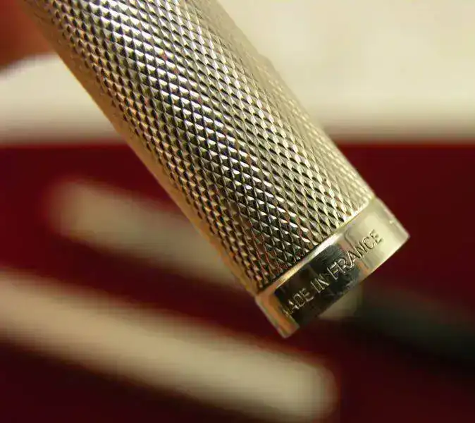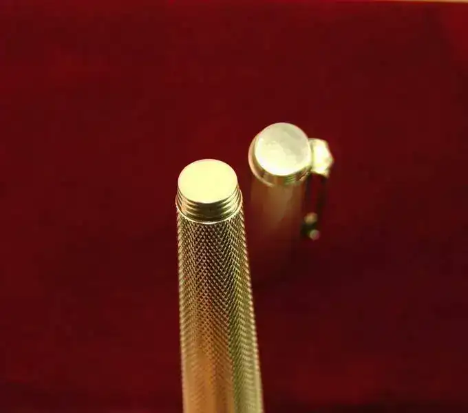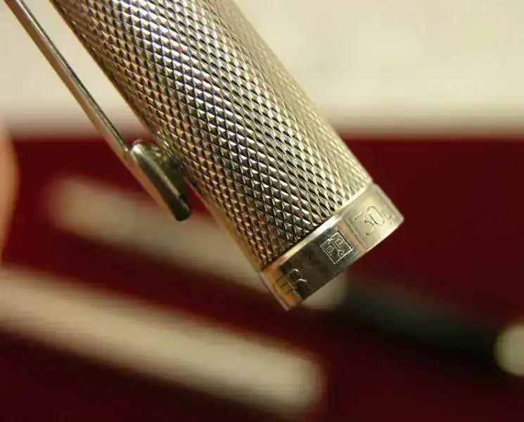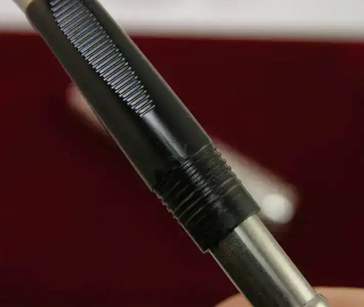 Las piezas tiene pocas señales perceptibles de uso, y su estado general es bueno. El principal defecto son unas marcas en la boquilla de resina junto a la zona de rosca, que no afectan al funcionamiento ni son visibles con la pluma montada. Se pueden observar en la foto de detalle. El bolígrafo incluido necesitará carga nueva, aunque lleva la original. Su estado también en bueno.
