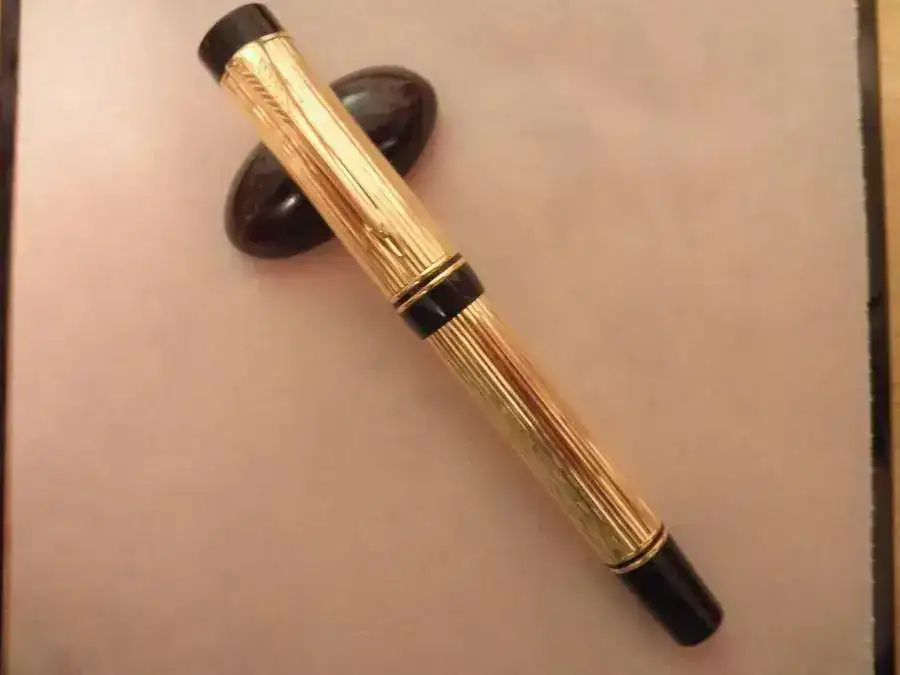 Tiene su plumin de oro original de 18 k en punto F, con el diseño de flecha que corresponde a este modelo; si el comprador lo prefiere, puedo cambiárselo por uno de oro de 14 k en punto B (no. 51, en la numeración de Parker de ese momento). No puedo dar los dos, porque dejaría huérfana a otra pluma.