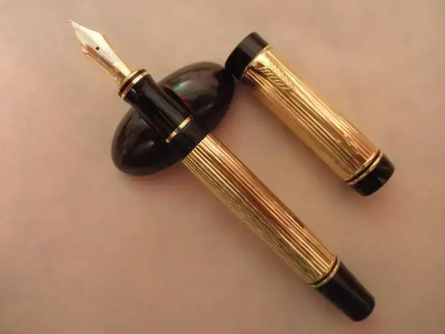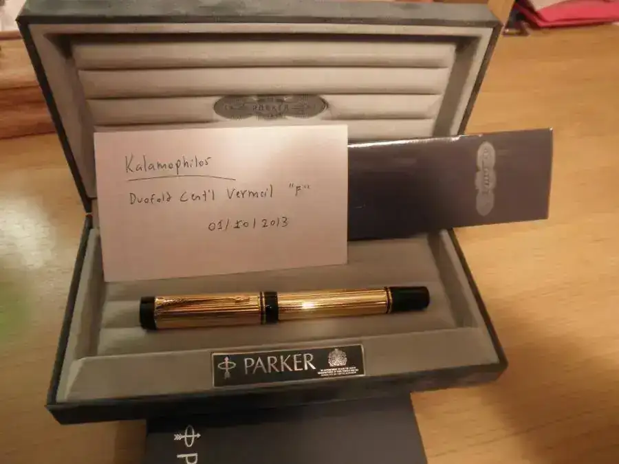 Pongo a la venta una de mis plumas de la sección de metales: la compré en un momento en que pensaba coleccionar diferentes acabados de Duofold, pero al final he decidido que me quedo sólo con las Duofolds de colorines. Es el modelo Centennial (el grande, 14 cm cerrada) y es el acabado Vermeil, es decir, plata 925 (marcado) con plaqué de oro de 22 k por encima. Ojo, oro sobre plata, no plaqué sin más.