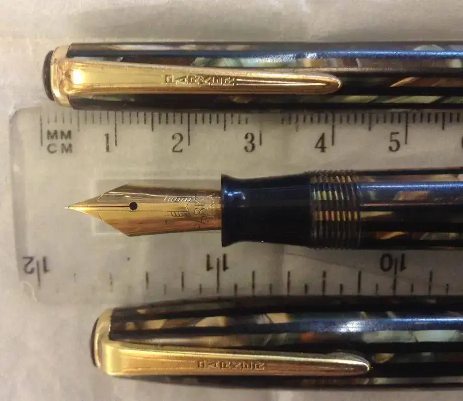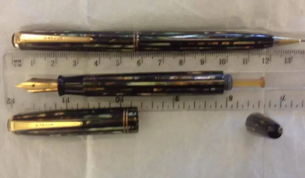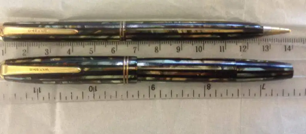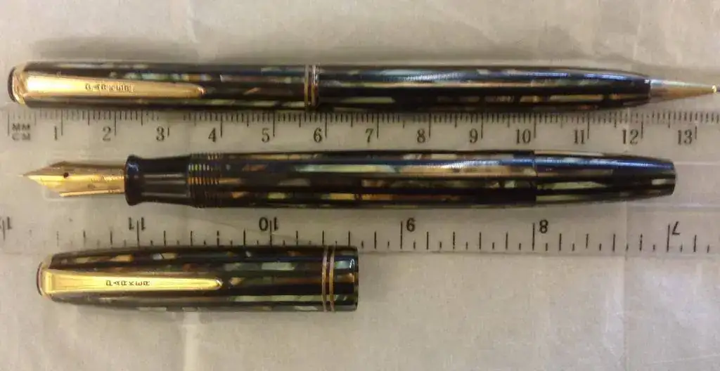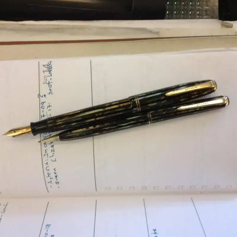 Vendo una de las pequeñas joyas de mi colección. Es una Parker Duofold (pluma y lapicero) de celuloide y fabricado en USA en 1941. El sistema de carga es vacumatic y funciona correctamente. La tinta que carga permite un uso fiable y prolongado con un tamaño discreto y manejable. El lápiz funciona correctamente y tiene mina de recambio. Estéticamente están impecables como se puede apreciar en las fotos y solo se observa una ligera decoloración en la protección metálica del lapicero, junto a la mina. Ámbos están marcados en en sus cuerpos con "Parker Duofold" y "Made in Usa".