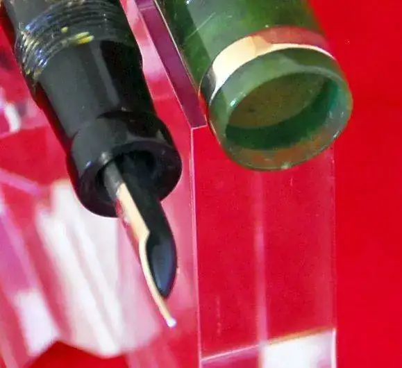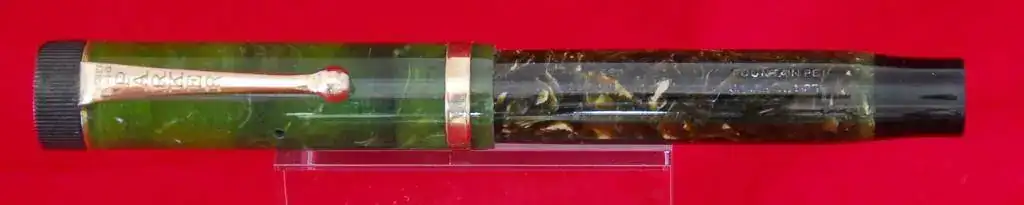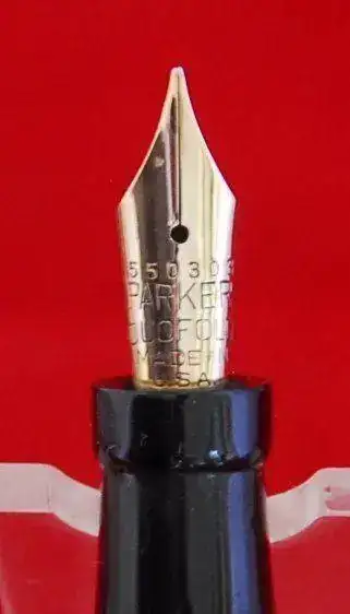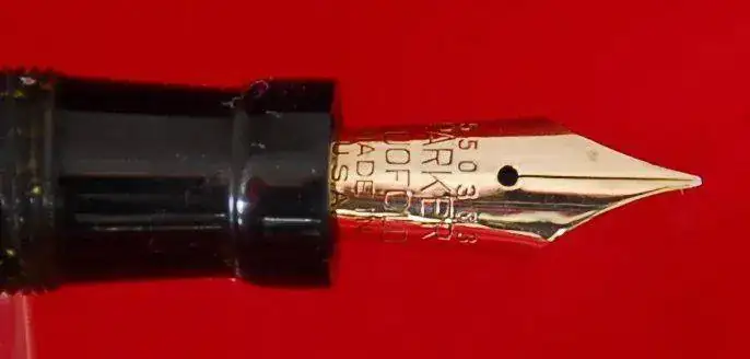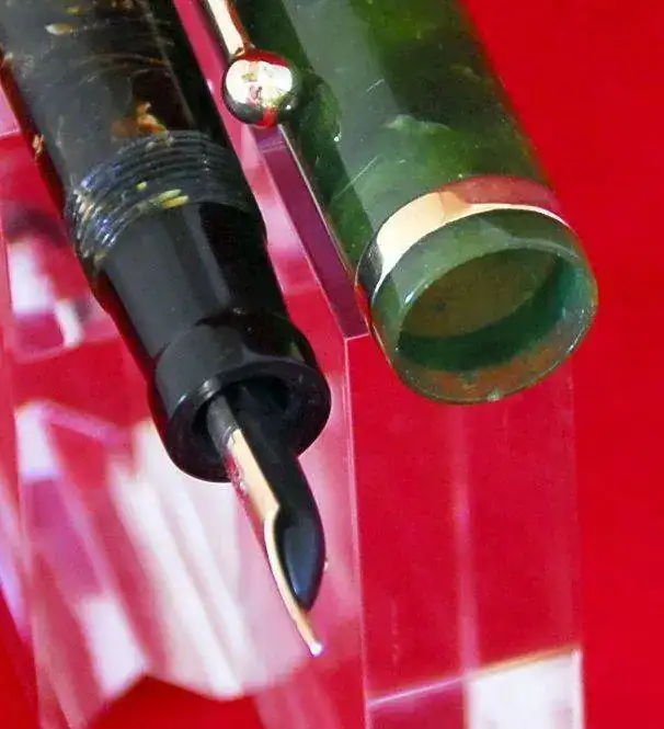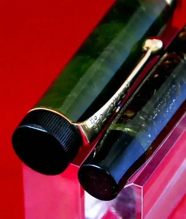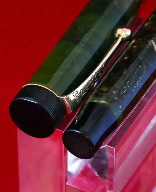 ESTA PLUMA ES DE PERMANITE - PRIMER PLASTICO USADO EN ESTILOGRÁFICAS Y LLAMADO ASÍ PARA PARKER Y RADITE PARA SHEAFFER - Y AL IGUAL QUE TODOS LOS EJEMPLARES DE ESTE MATERIAL Y ÉPOCA, COLORES COMO EL LAPIS LAZULI, ETC, SUFRE LA CLÁSICA DECOLORACIÓN EN EL BARRIL POR LOS VAPORES DE LA TINTA Y AZUFRE DEL SACO DE LATEX ANTIGUO, ESTE PROCESO ES IRREVERSIBLE Y NO AVANZARÁ MÁS, NO OBSTANTE: