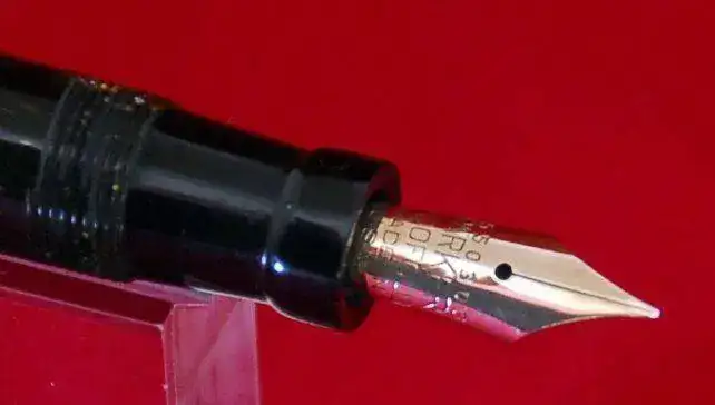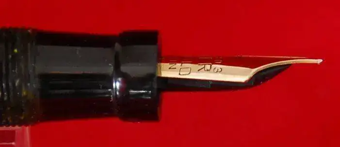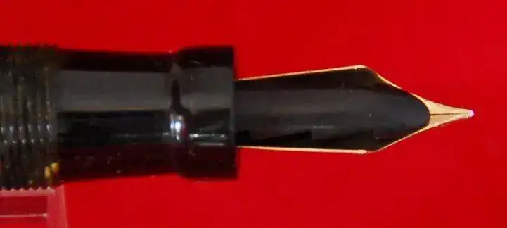 EL GRABADO DE MARCA EN EL BARRIL ESTÁ GASTADO PERO SE PUEDE LEER ALGO DE SU TEXTO Y CON AUMENTO ALGO MÁS, ESTA PLUMA DEBIÓ SER PULIDA EN ALGÚN MOMENTO, LA PÉRDIDA DE INTENSIDAD DEL GRABADO INTUYE ESA CAUSA