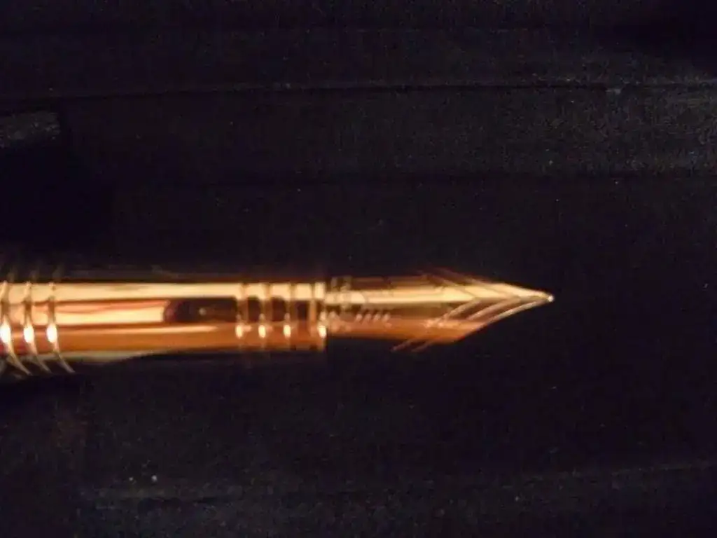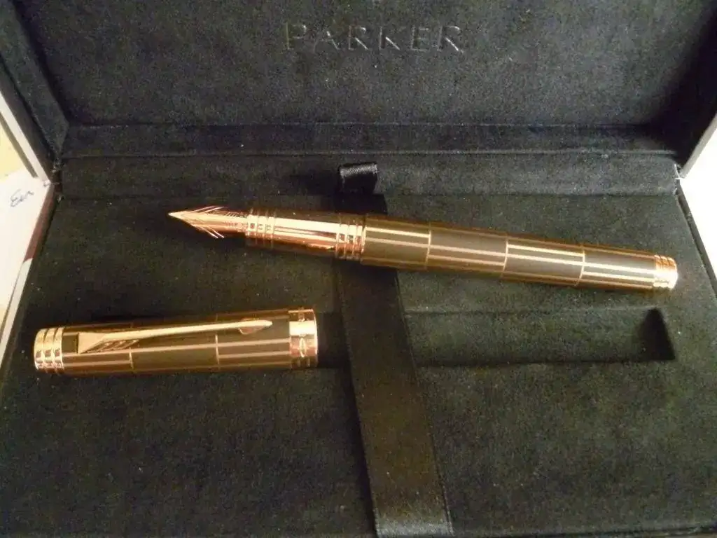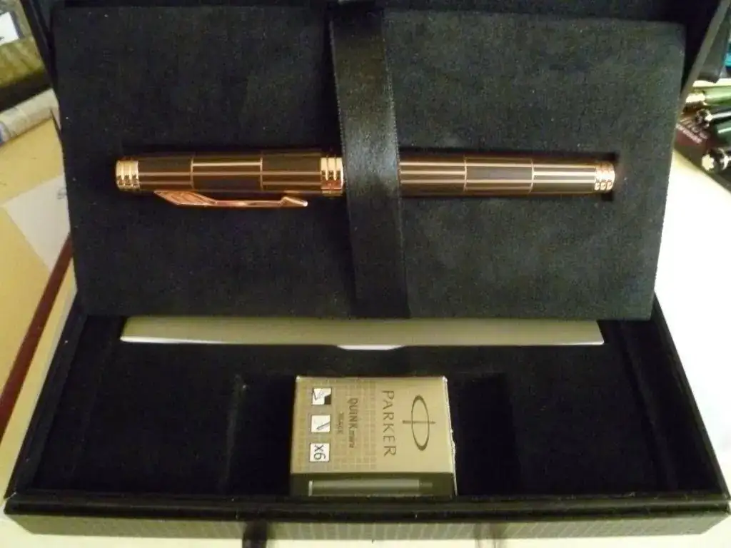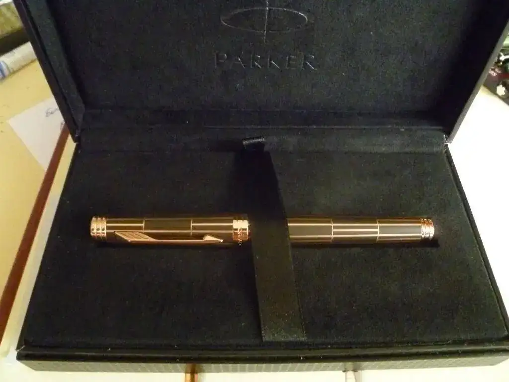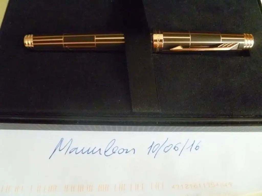Pongo a la venta esta pluma, de factura y presentación muy cuidada y lujosa. Como se asegura en el título, es nueva, y se ha pedido a la moderación el correspondiente permiso. En laca marrón y ornatos de oro rosa, tiene un tamaño bastante considerable, y un plumín de 18 Kt "F". Viene con todas las cajas en perfecto estado, convertidor y una cajita de cartuchos de tinta negra.