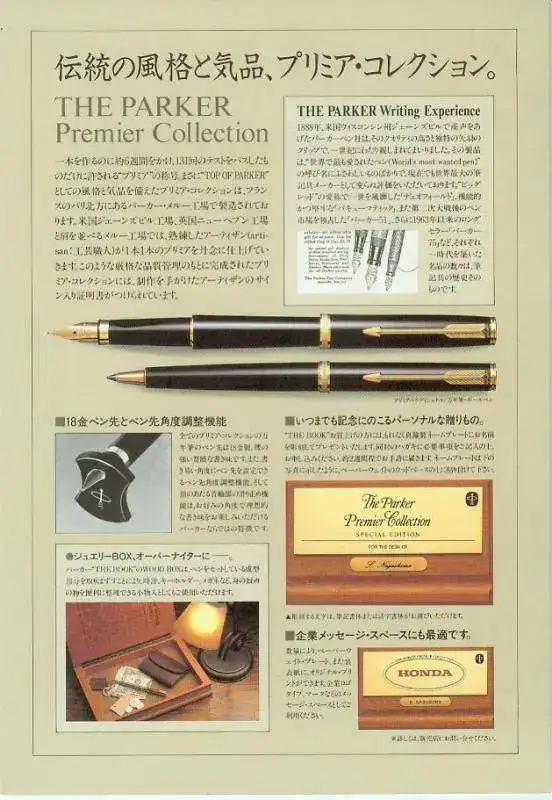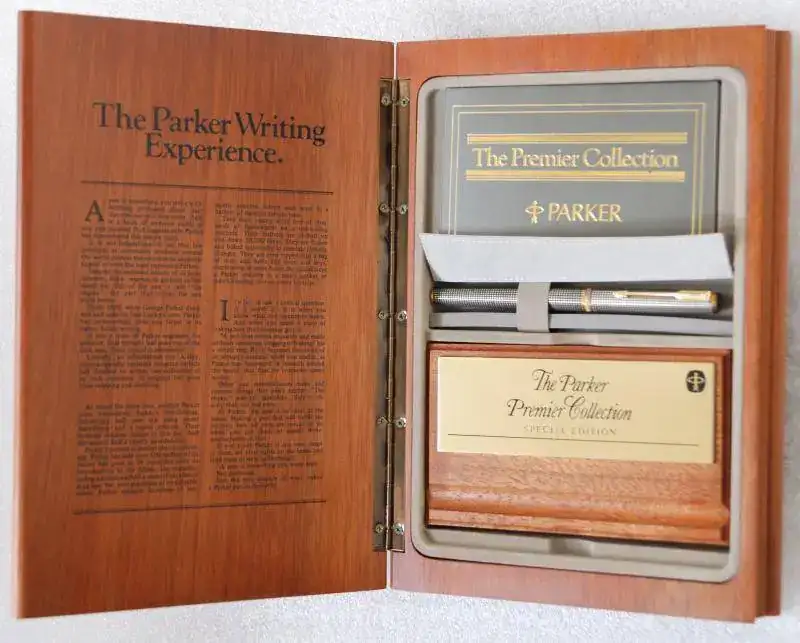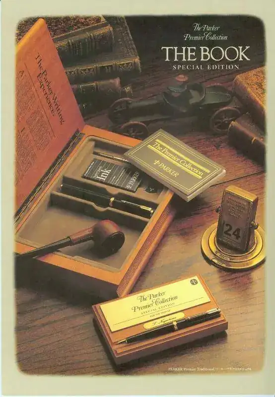 Como curiosidad, también mencionar la existencia de una edición especial denominada “The Book” que se realizó exclusivamente para el mercado japonés en 1987. Esa edición contenía la pluma Premier que podía elegirse en varios acabados (excepto Presidential), acompañada o no de un boli a juego, espacio para cartuchos y recarga del boli, un soporte/pisapapeles en madera con una placa dorada personalizable para el escritorio, la herramienta de plástico para ajustar la orientación del plumín y los documentos de la serie, todo ello en una caja de madera de nyatoh (similar a la teca) con forma de libro que podía utilizarse independientemente o para guardar el conjunto. No he visto constancia de que la serie fuese numerada.