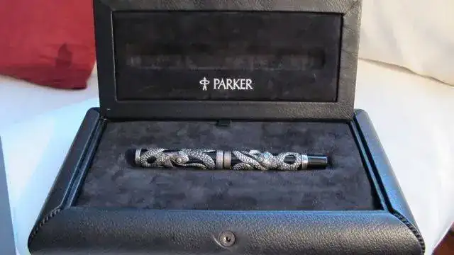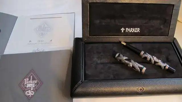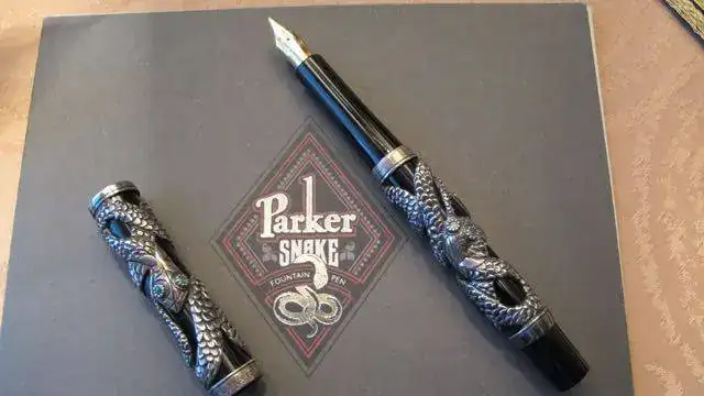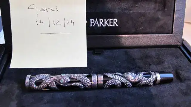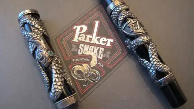 Se trata de una Parker Snake en resina negra, plata y esmeraldas (los ojos de las serpientes).