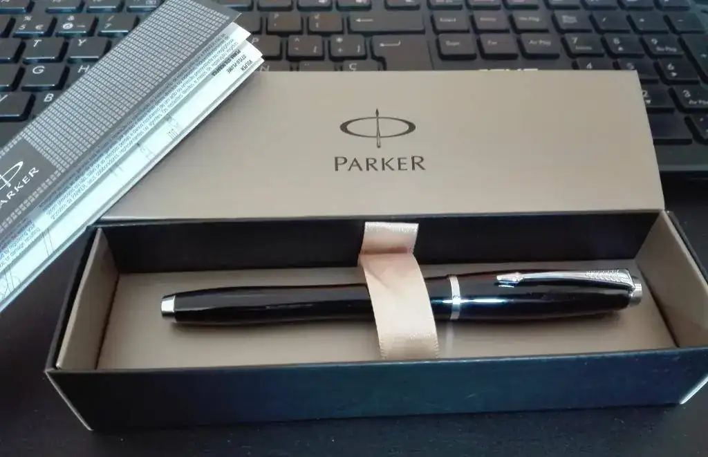 Con su caja, folleto y convertidor Parker. Teniendo en cuenta que su precio nueva en la actualidad ronda los 50 € en el mercado ésta es una buena ocasión.
