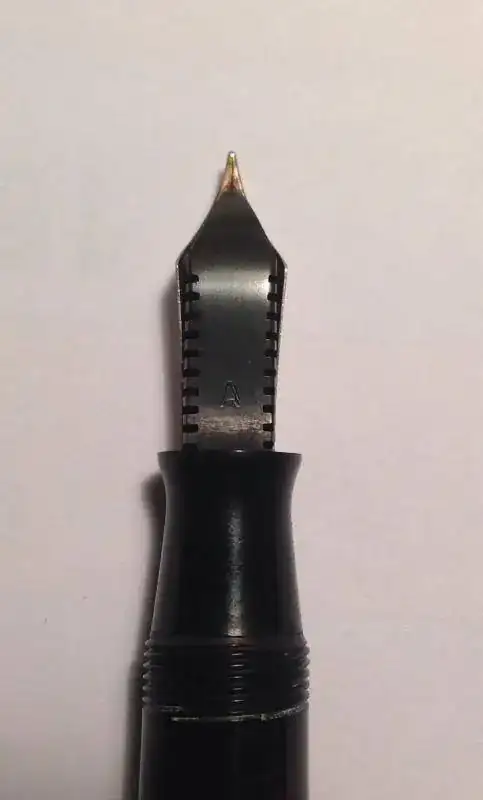 Es una Vacumatic Major de 1941. Tiene unas características que ya no veremos juntas en las Vacumatic de 1942 y años siguientes. La banda dorada, piedras? en los extremos del capuchón y el cuerpo de la pluma, diamante azul, eje del émbolo de alumnio, longitud de 13,45cm y plumín bicolor. Creo que no me dejo nada. Si la banda dorada fuese un poco más ancha sería una Slender Maxima, pero no lo es. Es una Major de transición. Las posteriores serán más cortas, el eje del émbolo será de material plástico, el cuerpo de la pluma perderá el adorno negro del extremo y el plumín ya no será bitonal. Una simplificación que representaba un ahorro de materiales que eran necesarios para el esfuerzo de guerra.