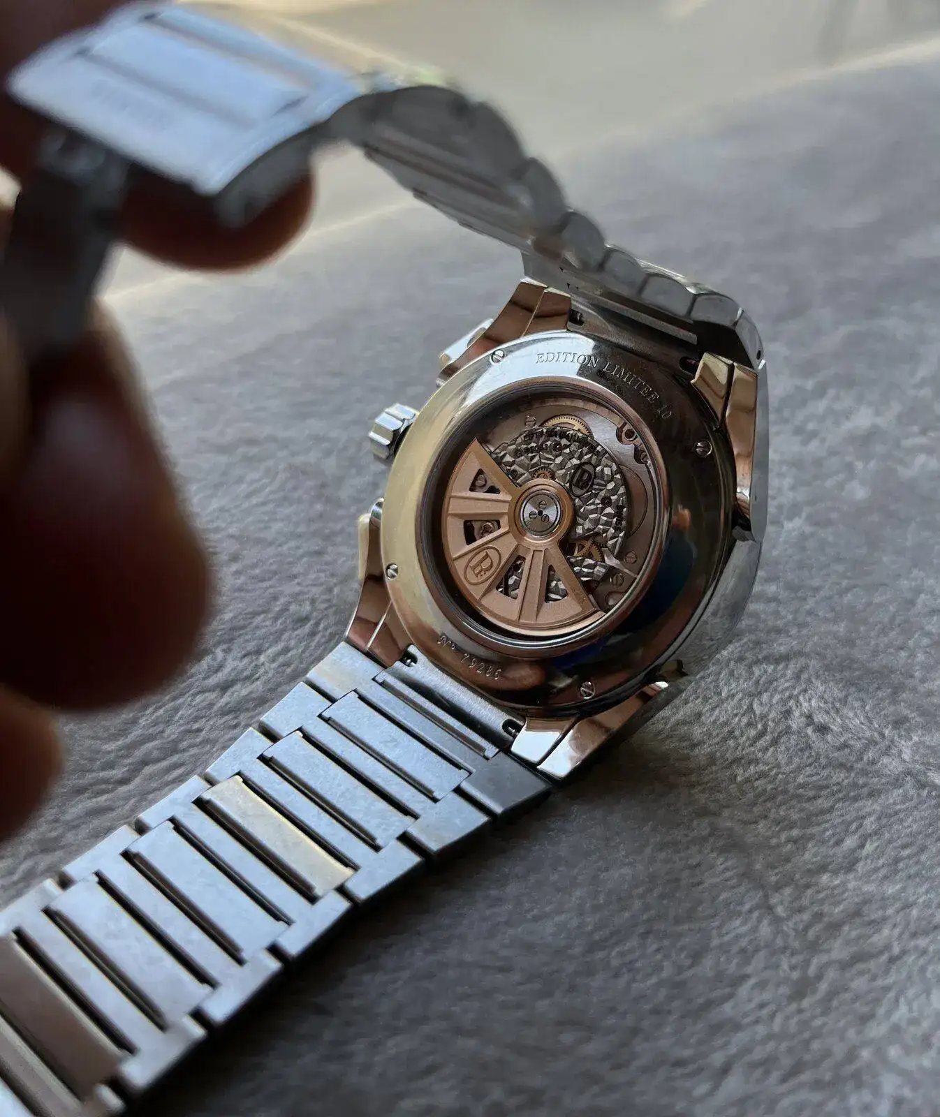 El calibre cuenta con 56 joyas, un total de 443 componentes y una decoración de estampado artesanal de al menos el nivel de ejecución de piezas de Patek ó de VC. Destaca su precioso rotor de oro de 22 kilates que brilla marcadamente contra la platina, los puentes y la caja. Es manufacturado “in-house” considerando obviamente que Vaucher es como decir PF. Consta de dos módulos superpuestos para el crono y para el calendario anual respectivamente. Seguramente hubiera sido más sofisticada una estructura integrada en vez de modular, pero entonces el precio puesto al reloj (para lo que ofrece en su sector es extraordinariamente competitivo) no habría soportado el coste del desarrollo. Y este calibre PF043 es suficientemente bueno para ubicarse muy arriba en los relojes deportivos de lujo actuales. Tiene una WR de 100 metros que siendo crono es correcta y una reserva de marcha de 45 horas (ahí sí que creo tiene un punto claro de mejora aunque siendo automático esa carencia se minimiza en parte).