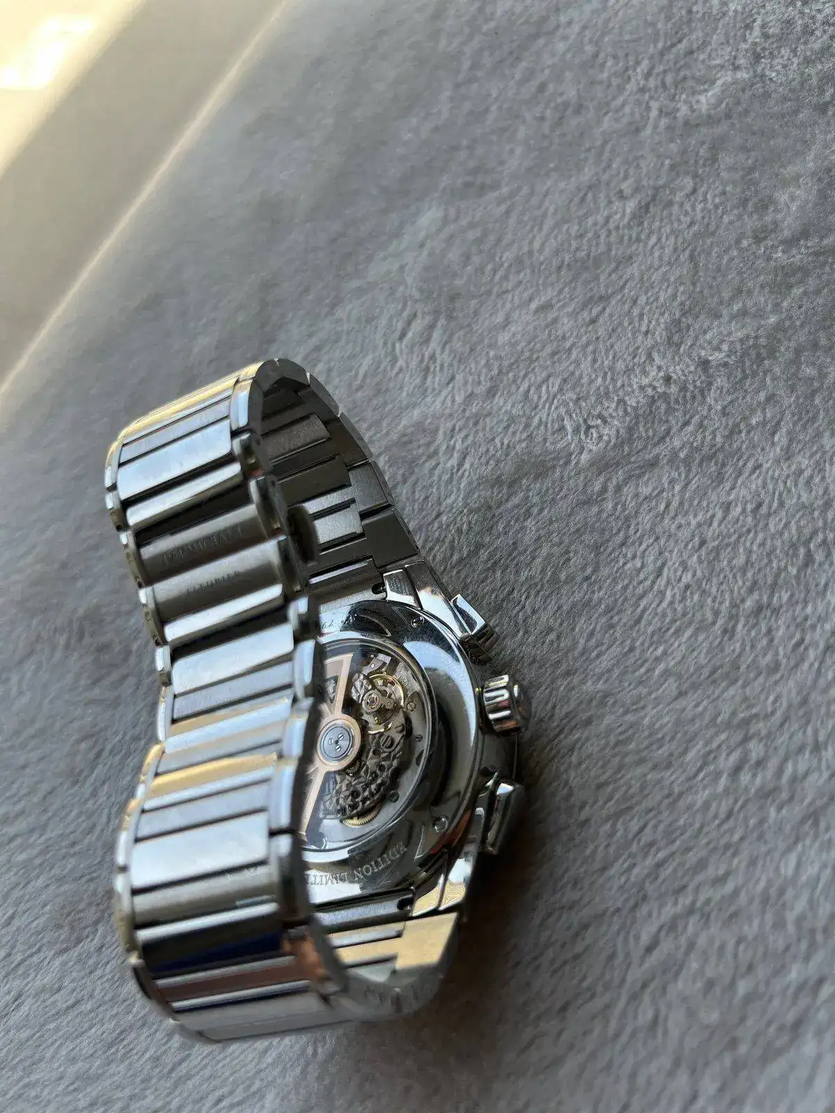 El brazalete fluye desde las asas simétricamente con sus eslabones exteriores pulidos a espejo de forma que parece una cascada de agua que surge desde los pulsadores del crono y las asas de la caja. Los eslabones intermedios contrastan excelentemente al estar cepillados de forma elegante. Y sin embargo los eslabones centrales perpendiculares a las filas exteriores están alternativa y secuencialmente cepillado uno y pulido el siguiente. El truco en esta clara armonía que destila la visión caja-brazalete está en que se diseñó el brazalete antes incluso que la propia caja. Por lo que el diseñador le dio una importancia extrema al brazalete al crear la caja. Este es también el motivo del equilibrio inesperado que se encuentra uno al llevar puesto este Tondagraph GT de 42mm. Sorprende cómo se adapta la pieza tan cómodamente a la muñeca a pesar de esas dimensiones que intuyen un peso superior del que realmente se siente.