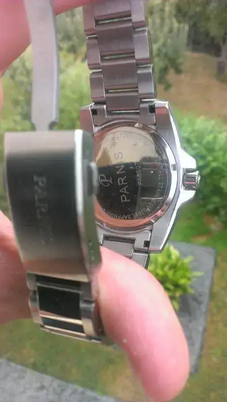 TRASERA: Acero sólido, tapa roscada y grabada con la firma Parnis, 6 puntos de agarre.