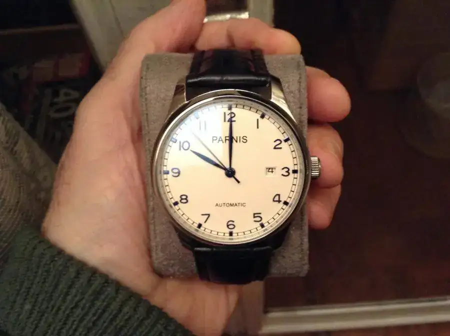 Este hermoso y nuevo Parnis con horas, minutos, segundos y dia mes. Esfera crema agujas e indices azulados. Solo 60€ y está en tu casa. Perfecto estado, correa mucha vida por delante.