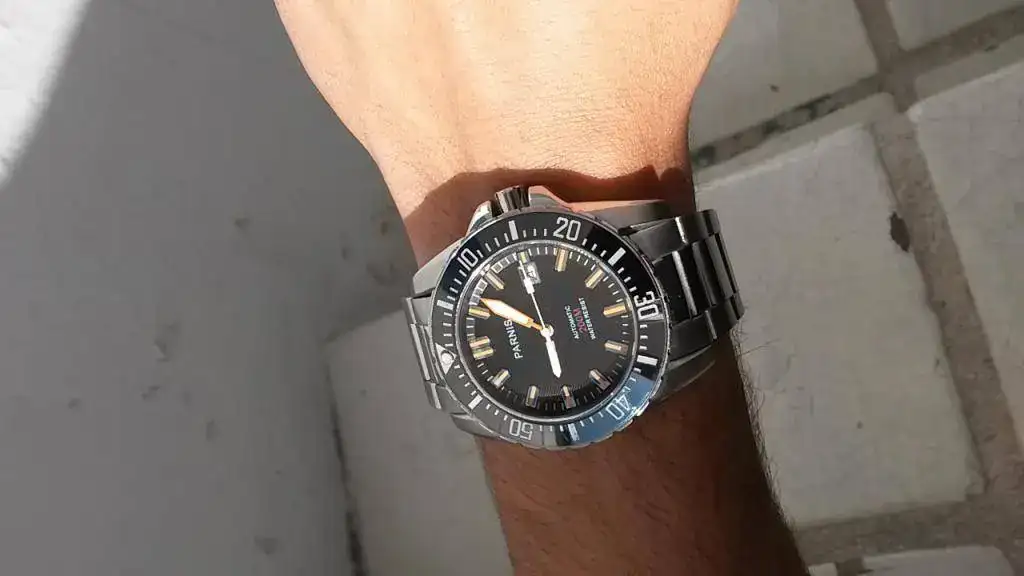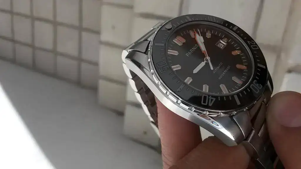 Saco a la venta este Parnis diver de caja de 43mm, con brazalete de acero, endlinks sólidos, bisel cerámico, zafiro, dial texturizado, índices naranjas y fecha. Tiene movimiento automático con remonte manual y fecha.