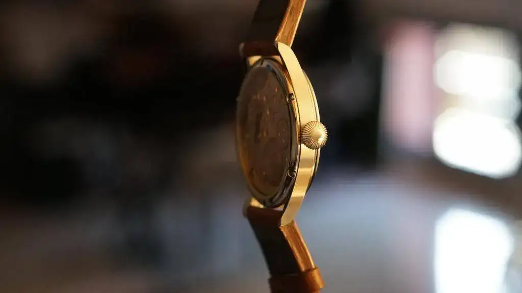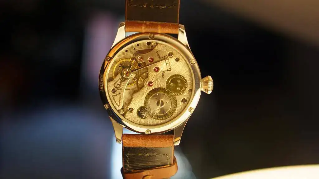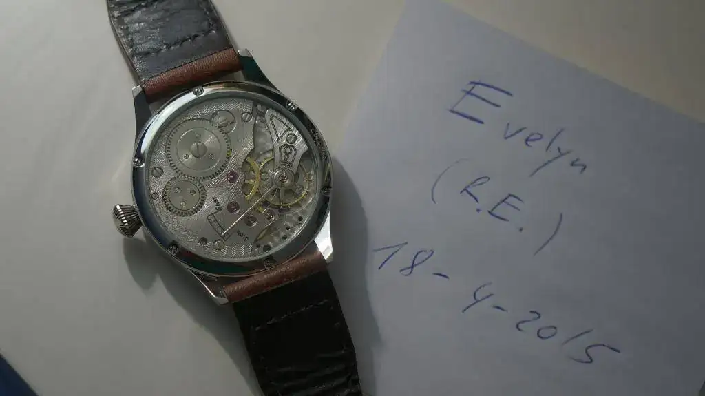 Va con vista trasera de la bonita maquinaria manual, que es un gustazo observarla. Cristales impolutos, los dos. El reloj iría con la correa original marrón que presenta señales de uso. No me interesan cambios.