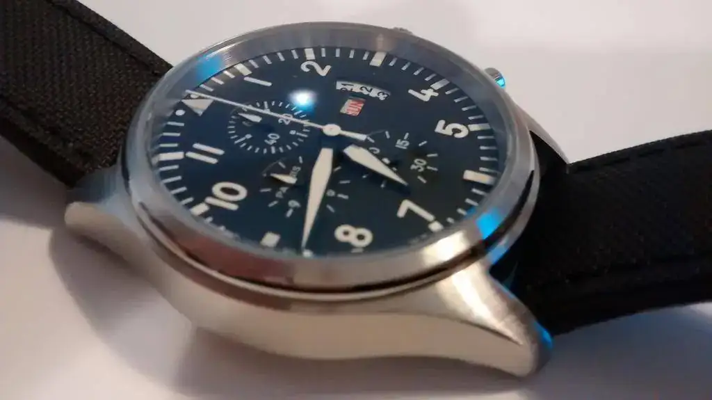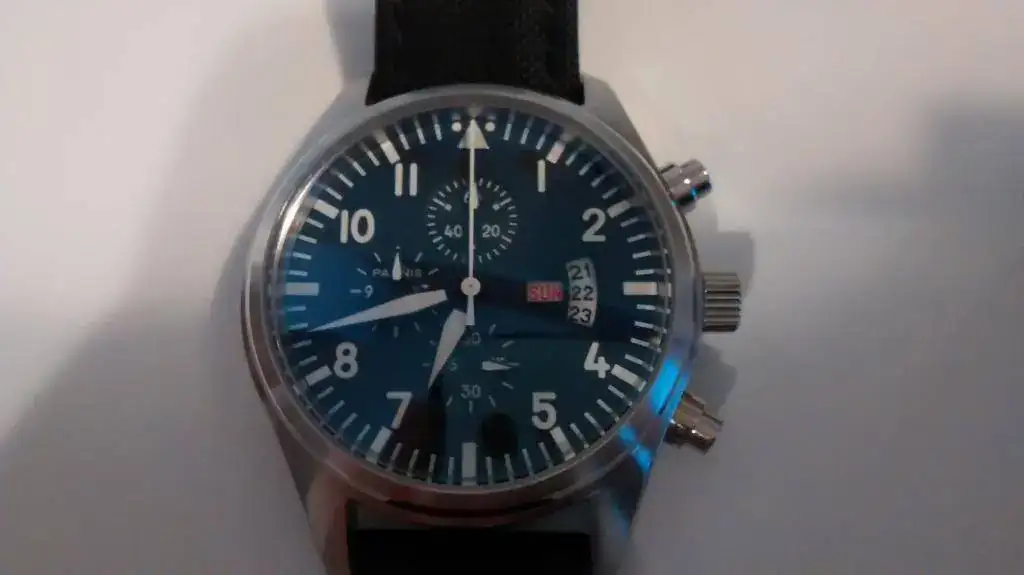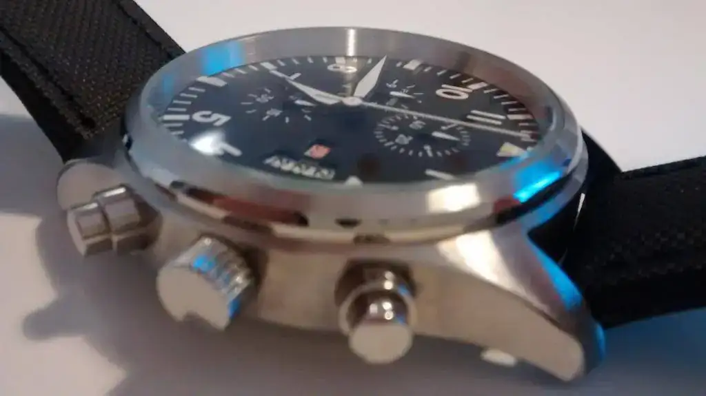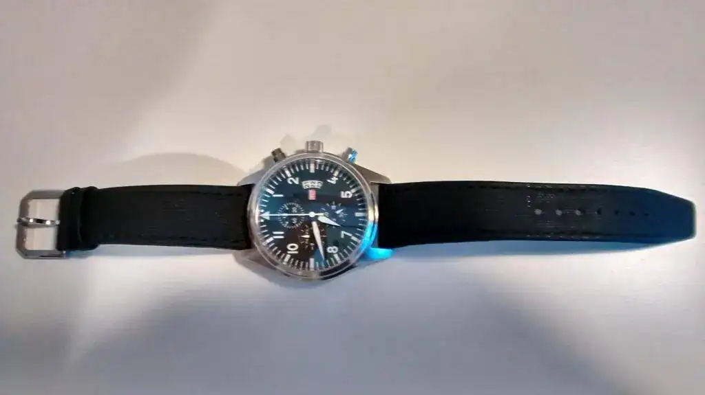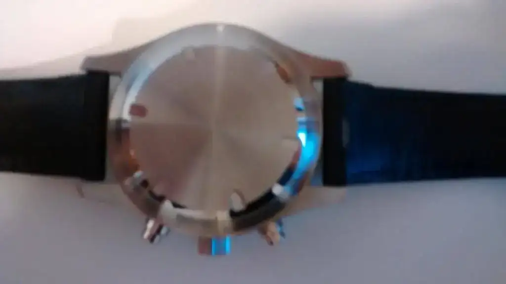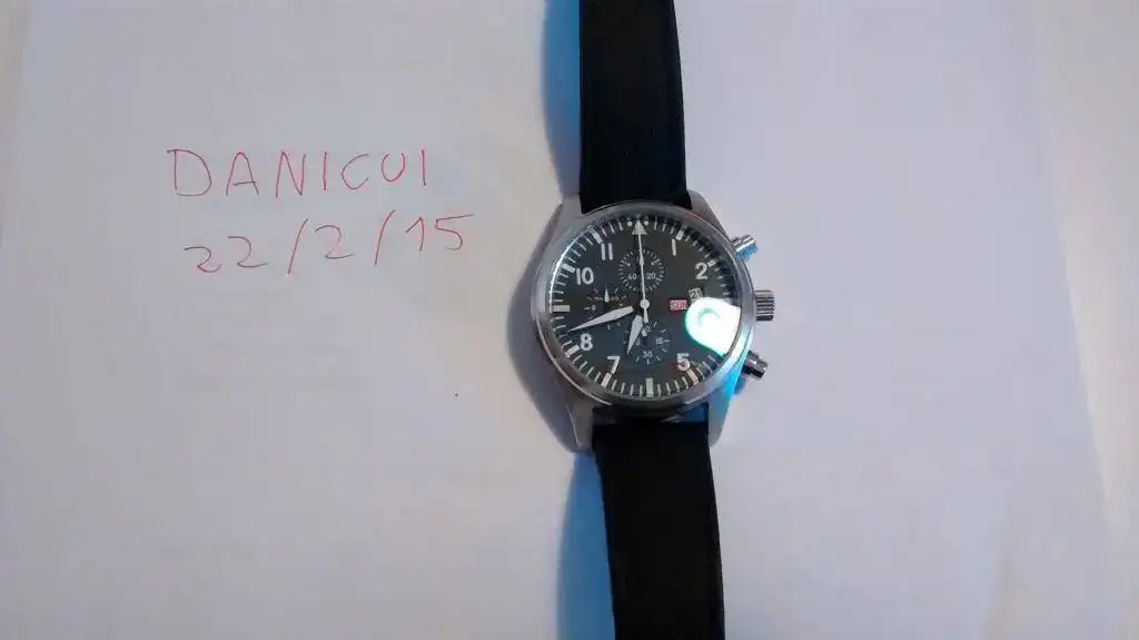 Lo tercero, algunos comentarios respecto del reloj: la caja es de acero cepillado AIS316L; tapa de fondo roscada; el reloj no tiene marcas ni arañazo alguno; la correa es la original del reloj con marcas de uso (yo diría que está al 80%, le queda mucha vida por delante); además del crono, tiene fechador y día de la semana.