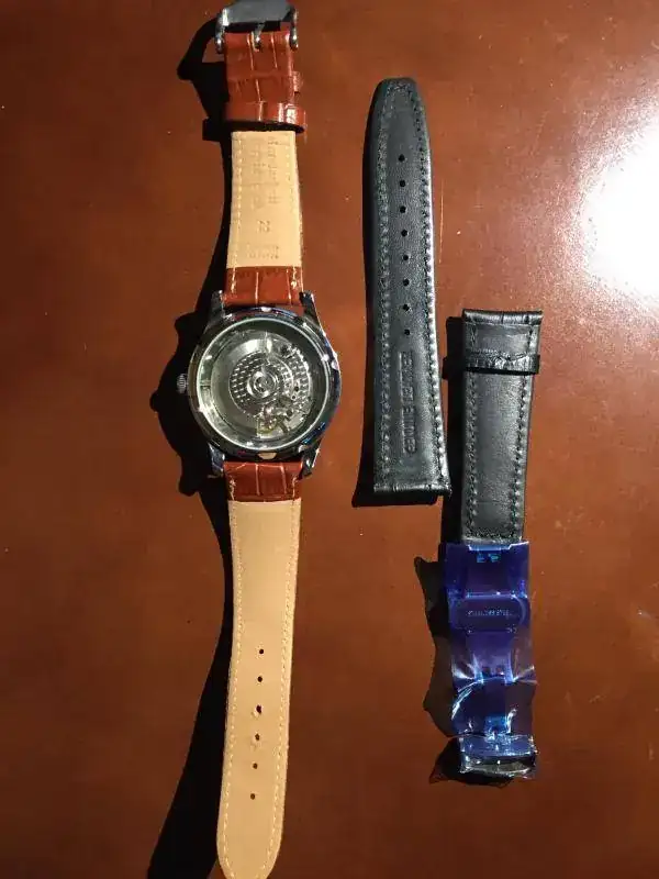 Buenas noches compañeros, debido al exceso de piezas que tengo, saco otra pieza. Comprada por mí nueva, hace un año mas o menos, pero con 5 puestas como máximo, está de reestreno, a las fotos me remito. El reloj es precioso y sus agujas azules llaman bastante la atención. La correa negra va con desplegable tipo mariposa, sin estrenar, aún con los plásticos, ya que me gustaba con correa marrón, y esta última, pues solo con mirar las fotos, se ve que esta al 99 %. Cualquier duda, más fotos o información por privado. Mi seriedad, basta con solo mirar mis transacciones y bonus, que van unos cuantos....