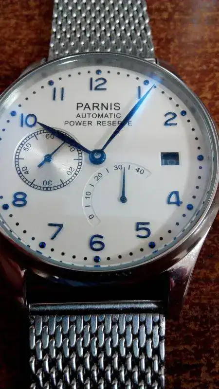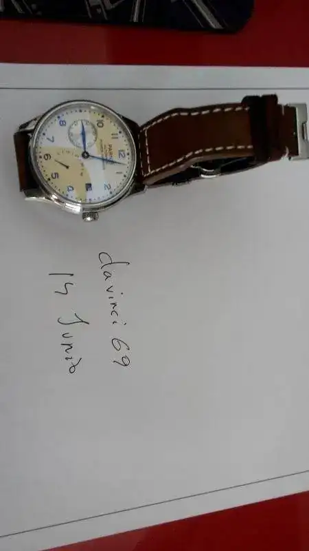 Saco a la venta este conocidísimo Parnis Portuguese con reserva de marcha. Lo he usado muy, muy poco. Para hacerlo más atractivo, regalo una milanesa que le va espectacular. El precio que le pongo es prácticamente el de la milanesa. Por ponerle un pero tengo que decir que la marcha del reloj es espectacular;Hasta que carga a tope la reserva (un par de días), entonces adelanta cinco minutos al día. Una vez leí en el foro que eso se solucionaba pegándole un golpe con la palma de la mano, pero como lohe usado tan poco no lo he necesitado hacer. De todas formas me remito a las fotos.