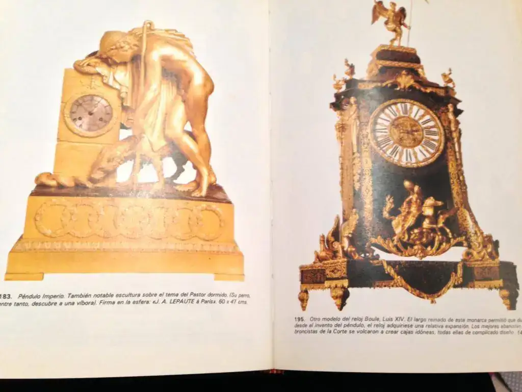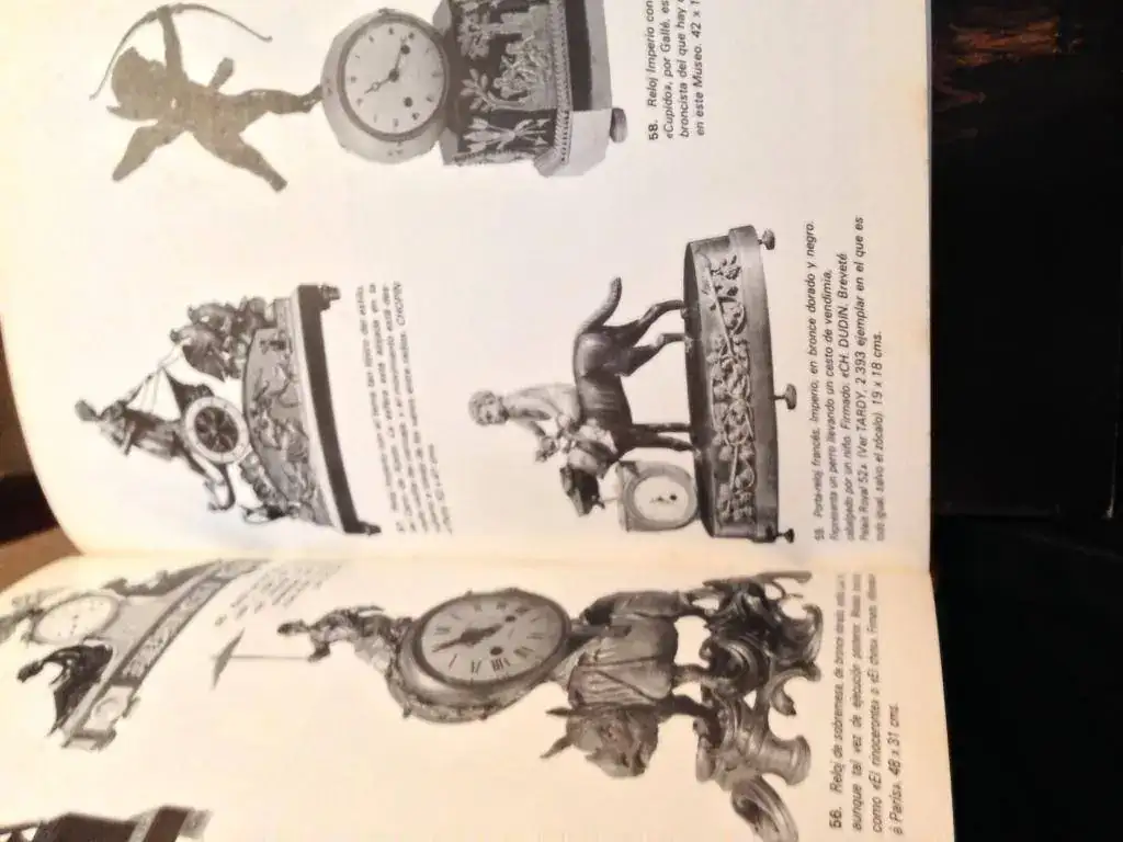 Lástima de foto donde se adivinan 3 relojes. El primero de la izquierda de la época de Napoleón III, custodiado por 2 ánforas, todo el conjunto realizado el mármol y bronce. En medio un reloj firmado “P.Laurill à Seville” con una representación en bronce de D. Miguel de Cervantes y a la derecha un reloj de inspiración egipcia realizado en mármol bronce y alabastros, custodiado por 2 obeliscos.