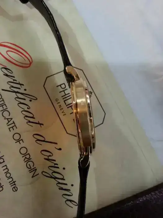 Calibre automático PP 310 SC, con punzón de ginebra, 33 mm. de diámetro, que realmente puesto parece mas, cristal de zafiro y caja de oro amarillo.