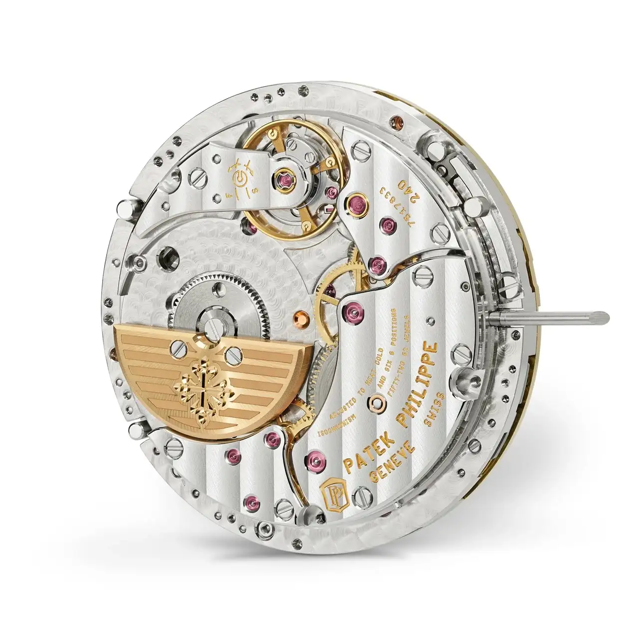 En el caso del 5822P-001 se trata un modelo completamente nuevo que se caracteriza por una combinación de indicaciones inédita en la Maison: gran fecha instantánea, día de la semana y fases de luna. El desarrollo de este nuevo movimiento -basado en el ya conocido 240, automático y extraplano- ha llevado a la presentación de 6 solicitudes de patente específicas relacionadas con la gestión de la energía para las distintas indicaciones y sus saltos simultáneos en 18 milisegundos. Además, estas innovaciones permiten corregir todas las indicaciones en cualquier momento (ignorando así lo que se ha venido conociendo como "horas prohibidas"). Presenta un minirrotor de oro de 22 kilates decorado con el mismo motivo de rayas de la esfera y dispone de una reserva de marcha de unas 42 horas.