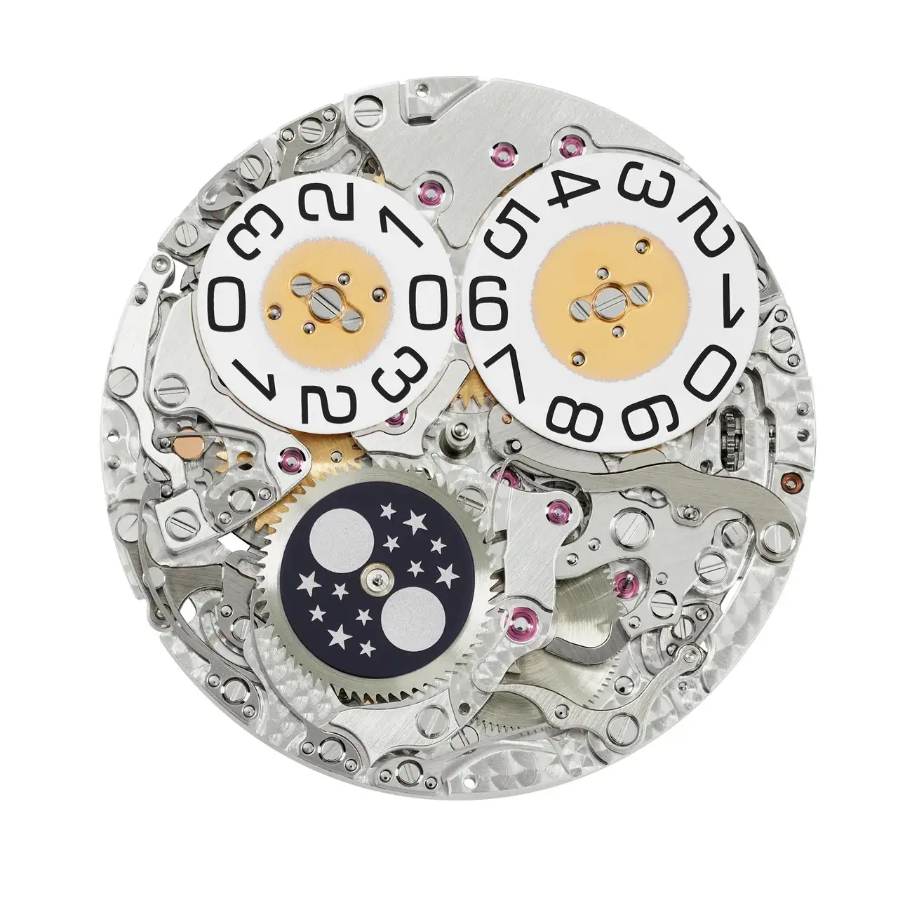 La gran fecha se muestra gracias a dos discos situados en el mismo plano y en una ventana enmarcada en oro blanco. El día de la semana es concéntrico con las fases de luna y se sitúa a la izquierda de la parte baja de la esfera mientras que el segundero continuo, más pequeño, se desplaza a la derecha.