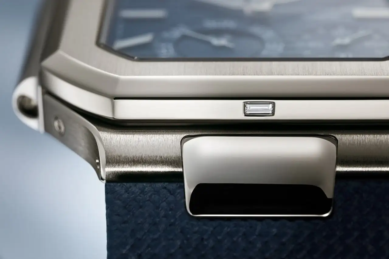- Caja de forma cuadrada con ángulos redondeados, en dos piezas con fijaciones laterales, de 45 mm de diámetro. Caja y bisel de platino con acabados en contraste pulidos y satinados. Diamante de talla baguette engastado a las 6 h.