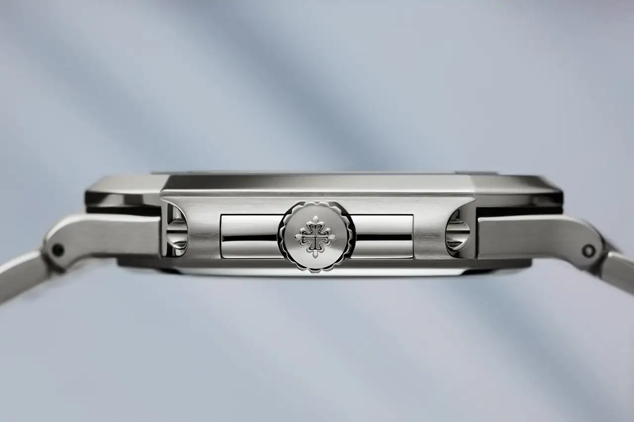 El brazalete de acero (satinado-pulido en los eslabones centrales) está equipado con un sistema de ajuste con bloqueo y un cierre desplegable patentado Patek Philippe con cuatro puntos de fijación independientes. Aquí sí está grabada la cruz de Calatrava.