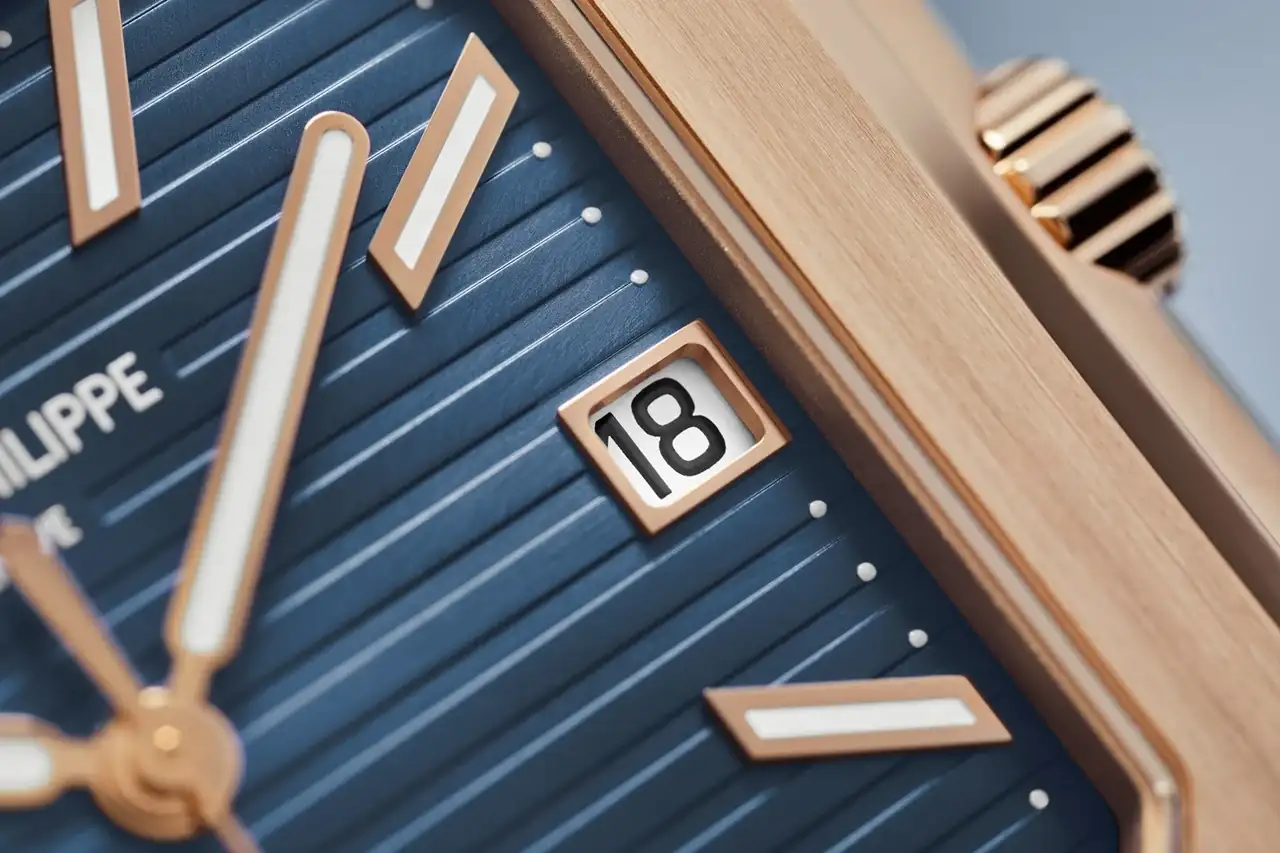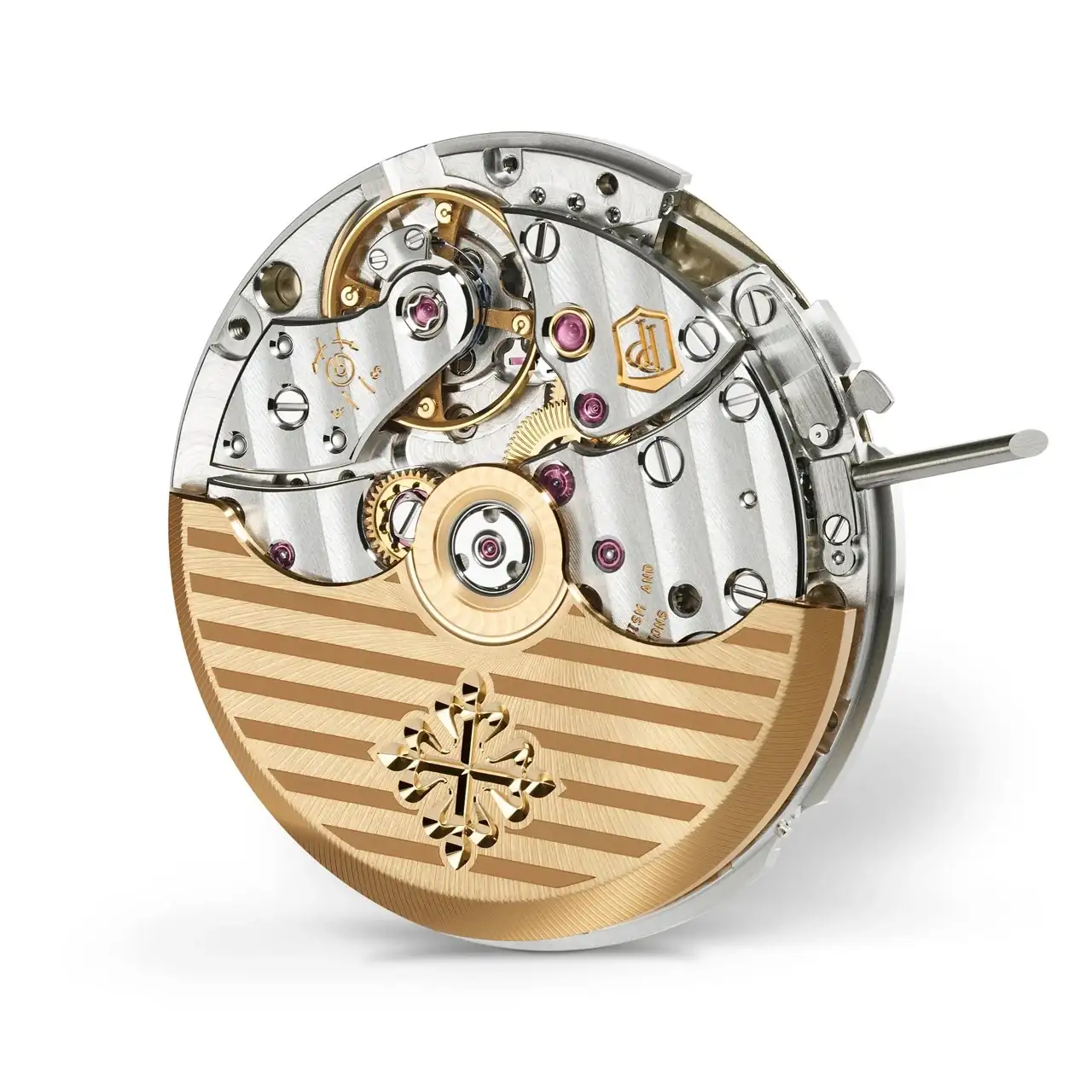 Sin entrar en la polémica de a quién se parece, el modelo 5821/1A es un solo hora de acero que comparte forma y acabados con el 5822P-001. También las dimensiones, aunque más delgado (8,3 mm) gracias a su nuevo calibre 26-330 S C de carga automática, desarrollado a partir del calibre base 26-330 lanzado en 2019 y dotado de un sistema de parada del segundero (40-42 horas de reserva de marcha). Algo que tiene un mérito añadido si tenemos en cuenta que la masa oscilante (de oro de 21 kilates y con la misma decoración de bandas que la esfera) es completa y no de micro-rotor como la del calibre 240. Es visible a través del fondo de zafiro transparente del que está dotado el 5821/1A.