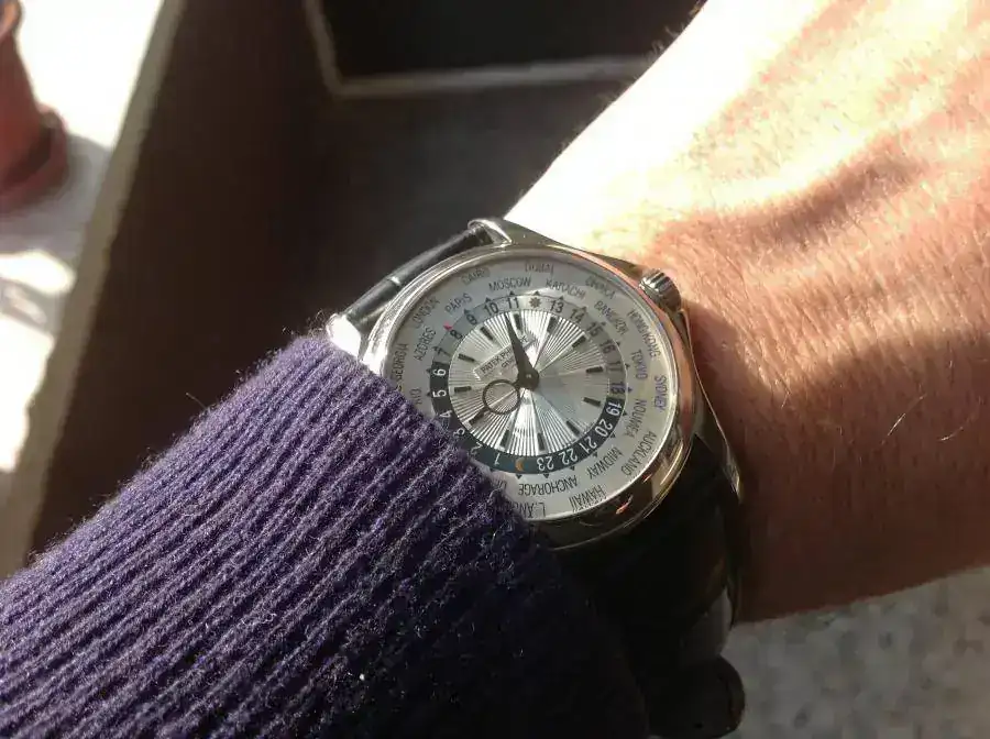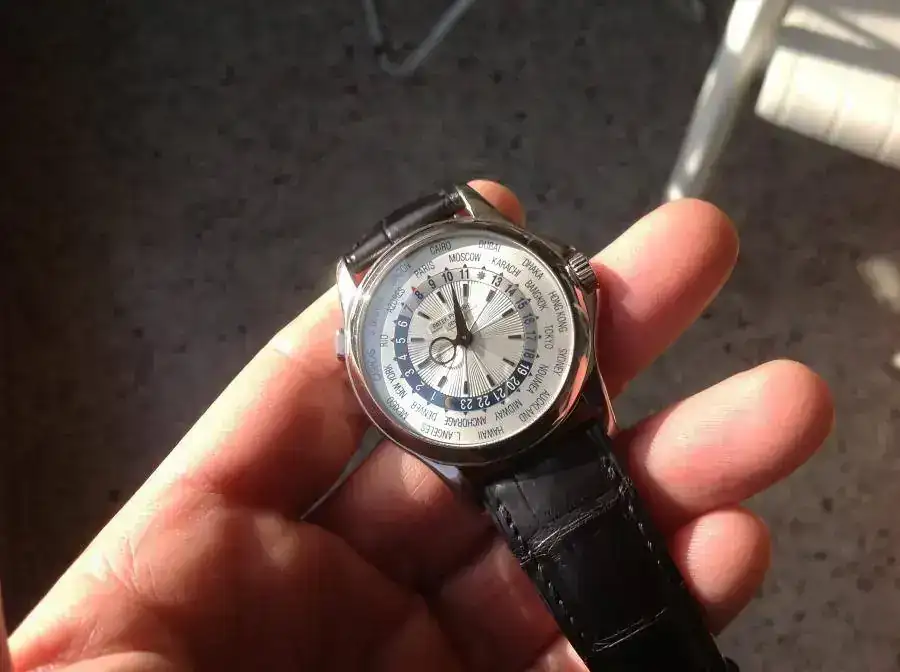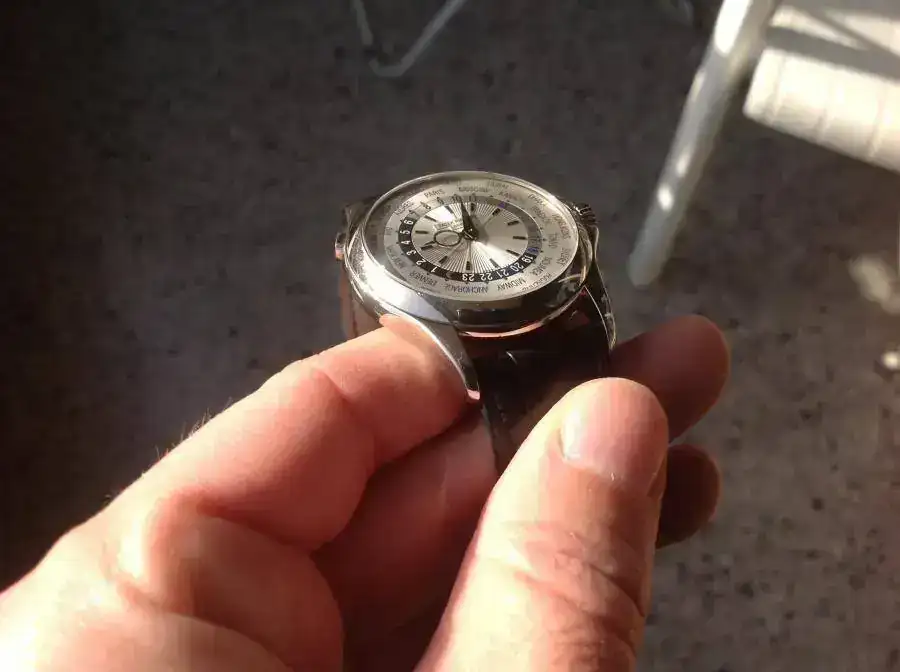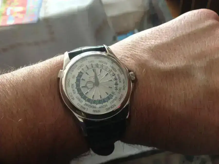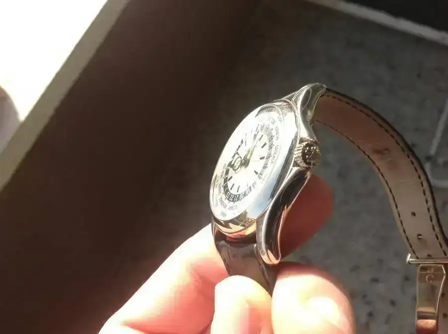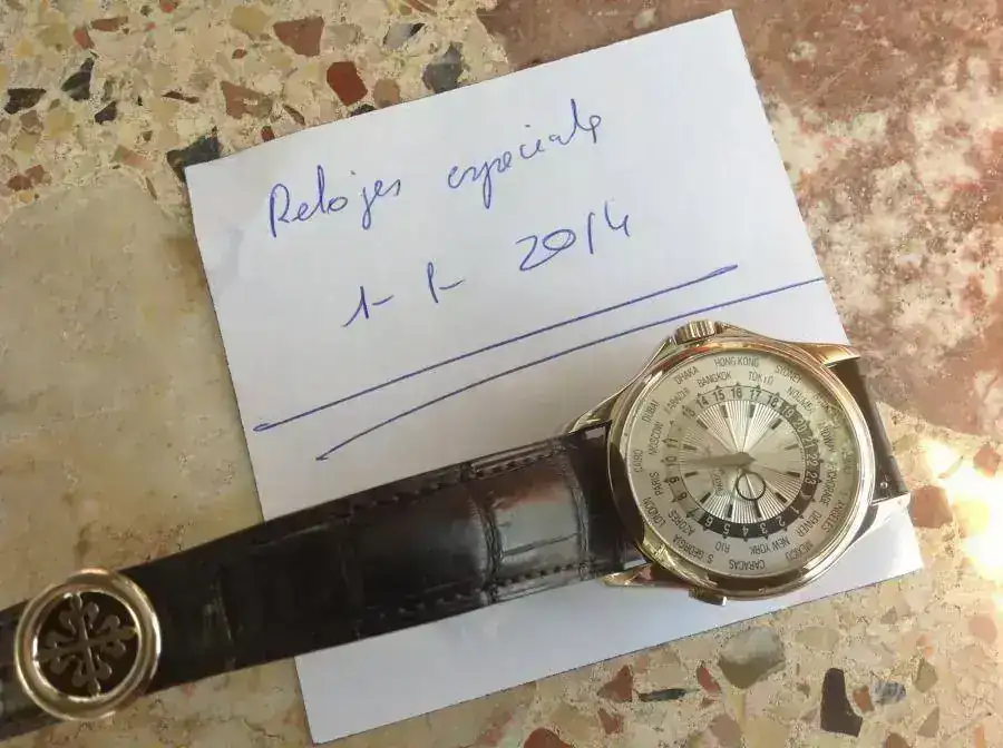 Vendo este Patek Philippe World Time 5130G en oro blanco comprado en concesionario oficial en febrero de 2011. El reloj se ha usado contadas ocasiones y por lo tanto esta practicamente nuevo.
