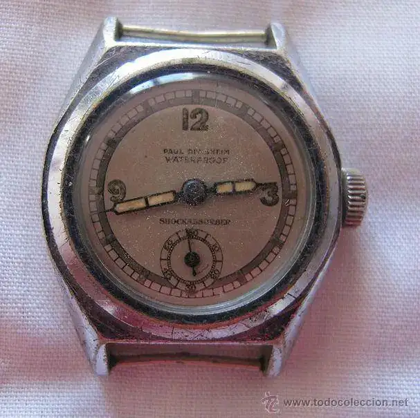 En la esfera aparecen además del nombre PAUL DITISHEIM, las leyendas WATERPROOF y SHOCKABSORBER y un sub-segundero en posición de las seis. Los números 3,6 y 12, así como los marcadores cada cinco minutos y las agujas minutera y horaria llevan material fluorescente (radio o tritio???).