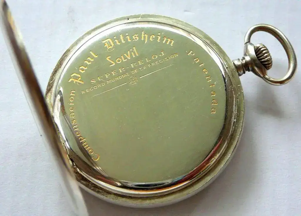 En la foto podemos apreciar que la esfera está firmada SOLVIL - PAUL DITISHEIM lo que sitúa a este reloj posterior a 1.930 que es cuando se empieza a utilizar SOLVIL como marca, además de aparecer GENÈVE que es donde radica la fábrica PAUL VOGEL tras la compra de la marca. Cabe destacar la aguja segundera que parece más una aguja horaria.