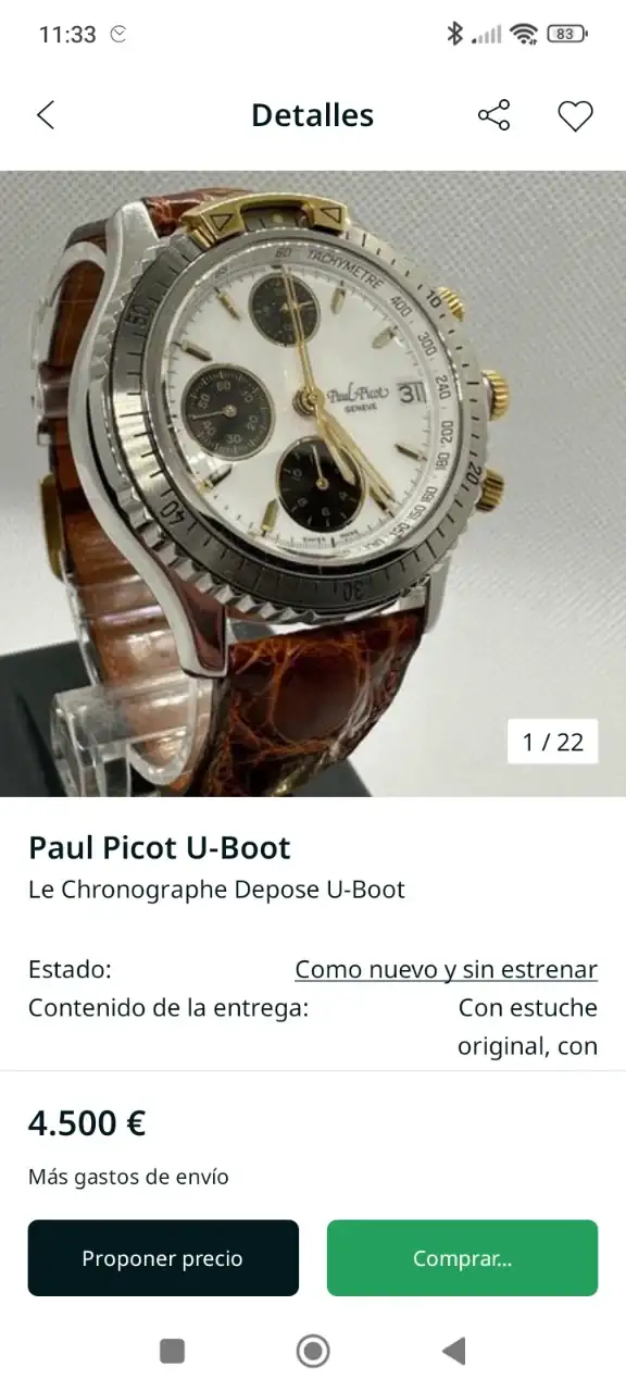 Es curioso que veo en Chrono24 precios muy dispares por este reloj, habiendo uno por 1300 bastante usado sin set completo, hay varios más y uno en concreto misma versión en acero (este que ofrezco es acero y oro siendo el bisel de oro macizo) en venta por 4.500€ (dos últimas fotos).