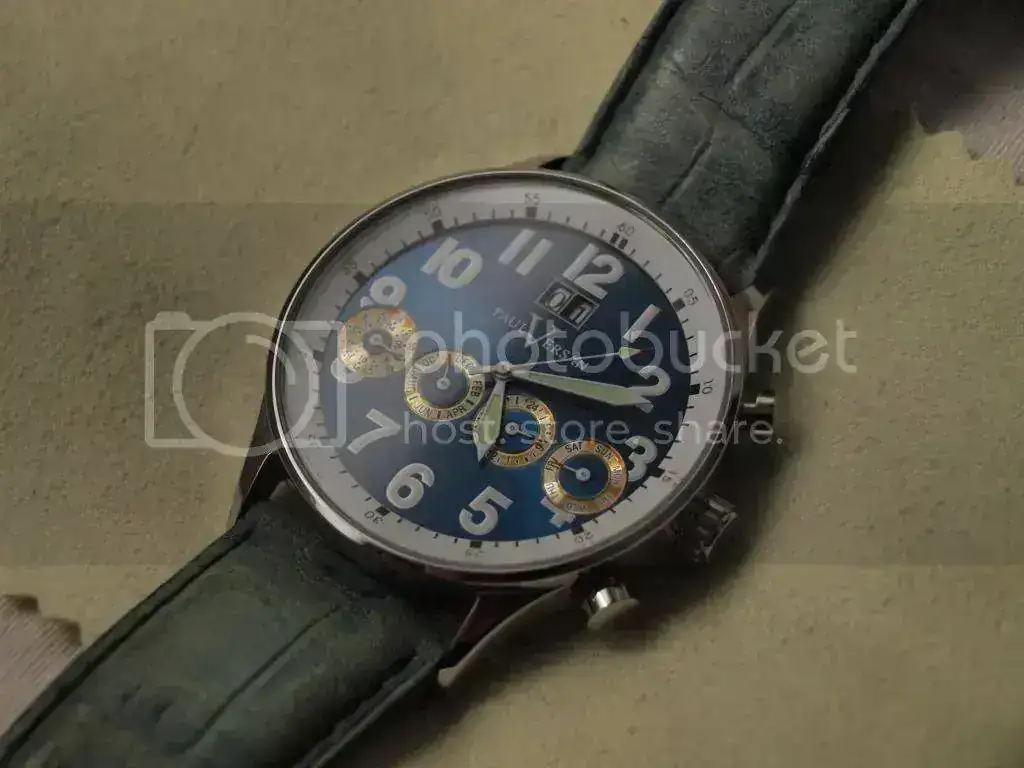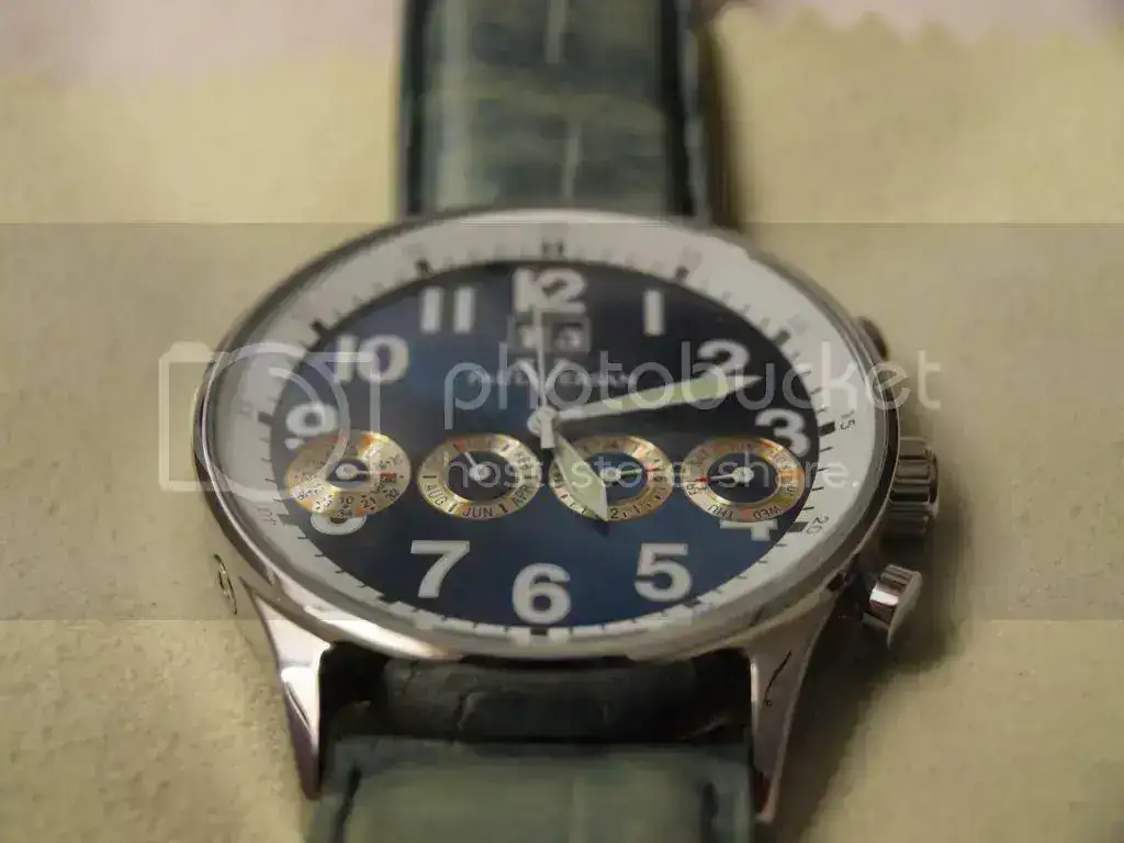 El reloj que os presento es un calendario completo "gran date" con movimiento automático. Lo que podría ser un Patek, pero hecho por artesanos chinos amantes de la tradición y el "savoir faire". En definitiva, un reloj muy resultón para el verano, con sus 44mm de diámetro y su esfera azul con efecto rayos de sol y cuatro subesferas -con una ligera pátina- que nos dan cuenta del día de la semana, la hora en 24h, los meses del año y hasta el mismísimo año, para los muy despistados.