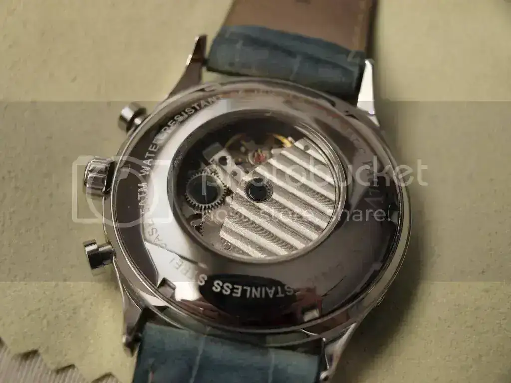 El reloj los compré yo hace la tira de años y siempre ha funcionado muy bien. Ahora, nada más agitarlo un par de veces echa a andar, aunque también se le puede dar cuerda, porque tiene remonte manual y parada de segundero. Un lujo, oiga. A destacar la caja, que está perfecta; ni golpes, ni rayas, ni nada de nada. El cristal también está perfecto. Lo único malo, la correa, que ha decidido desintegrarse con el tiempo para fundirse con el aire y reiniciar el maravilloso ciclo de la vida. El fondo es visto, el calibre está decorado y, por delante, la ¿luminova? de las agujas sigue brillando, aunque de forma nada espectacular, como una estrella en el ocaso de su vida.