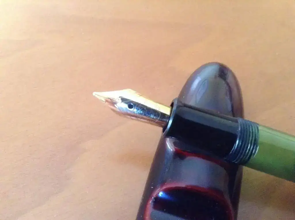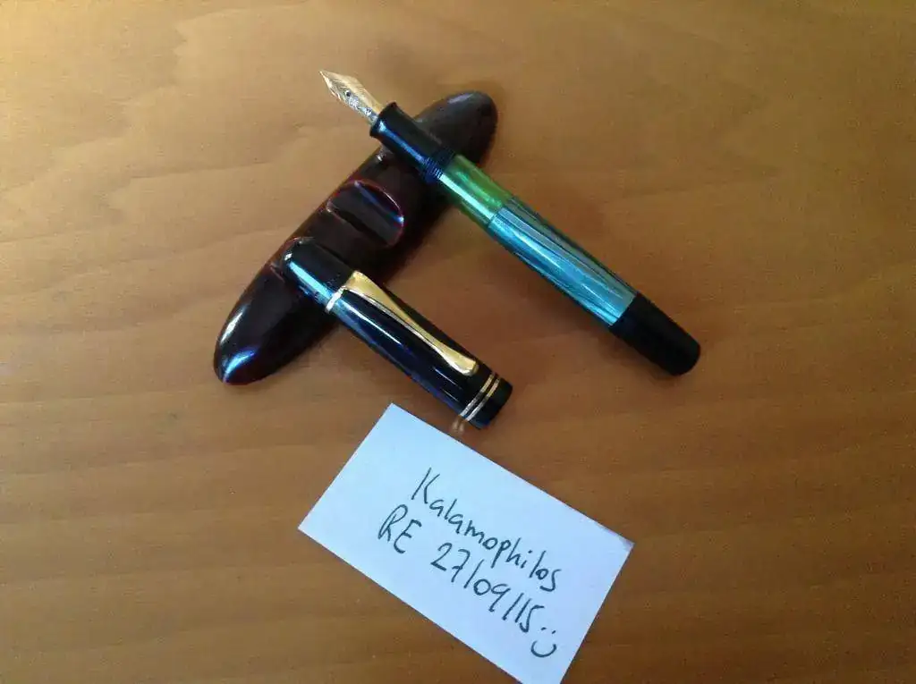 Pongo a la venta esta pequeña joya: una Pelikan 100 en celuloide verde, plumín 14 k original en punto M, alimentador de ebonita y en excelente estado: como nueva, sin herrumbre en los metales ni marcas en el cuerpo. Tiene puesto un pistón moderno de plástico, como se acostumbra ahora. Fijaos bien el estado en que está