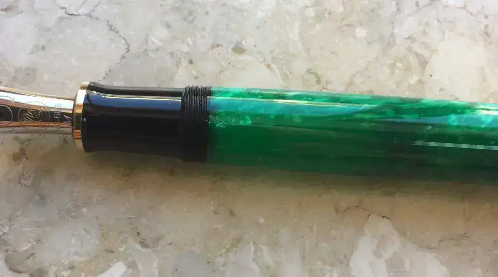 Es un color verde precioso, traslúcido, al punto que se puede ver el sistema de carga y el nivel de tinta. He hecho fotos con la pluma cargada y vacía para que se aprecie.