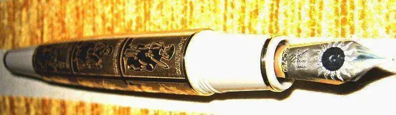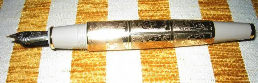 Destaca la elaboración artesanal del plumín de oro de 18 quilates, que lleva el Sol grabado en relieve,espectacular. El eje muestra temas del calendario de la vida cotidiana en la Edad Media. Están incorporados al eje metálico negro revestido con rutenio, perfilando fielmente los detalles y filigranas; después se han chapado en oro.
