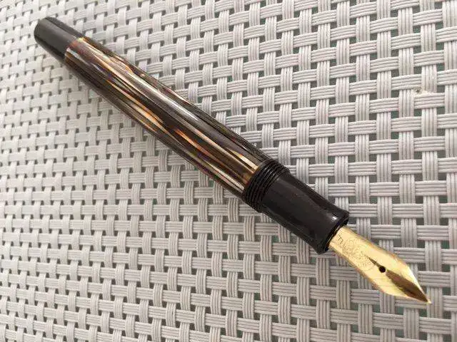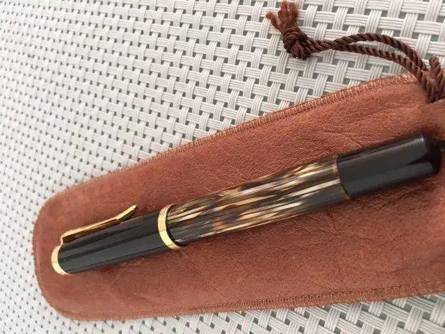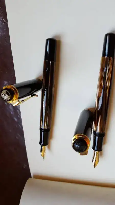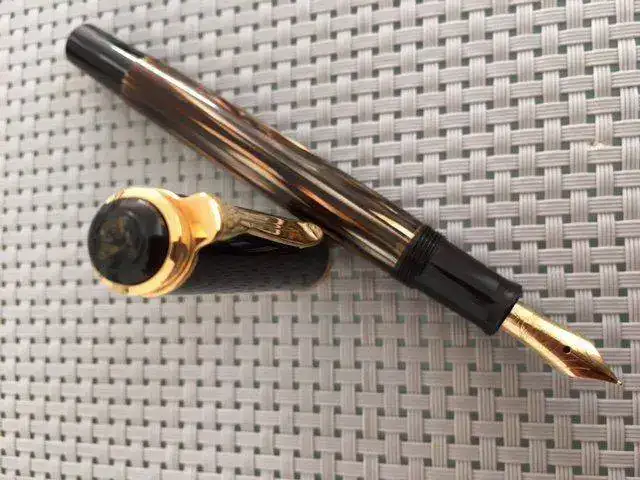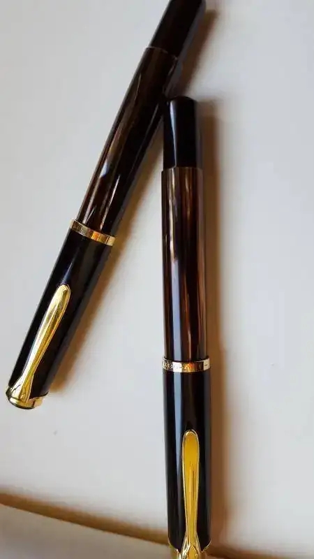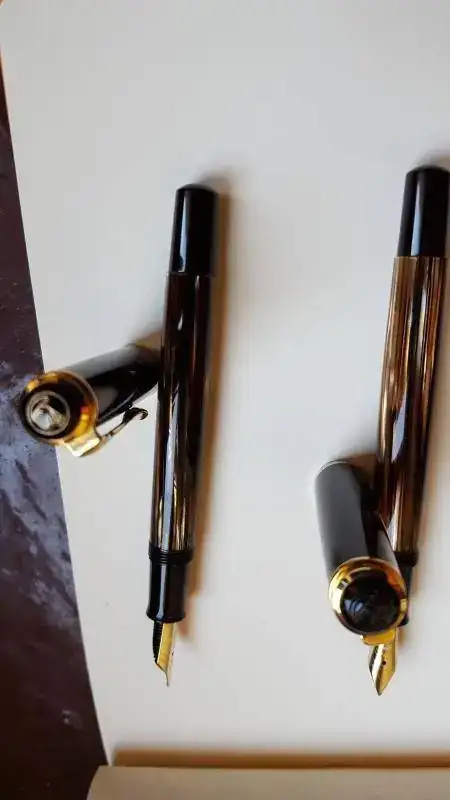 Yo con estas dos tourtois 400 ochenteras me conformo, ya sin el alimentador de ebonita, y una marcada W. Germany, y en plumines M y OB, semifles, que las nuevas seguro que el plumín es de los rígidos y vaya a Ud. a saber por el pico que saldrán, la verdad es que las uso no todo lo que quisiese, prefiero las cincuentonas, con un tortuga más claro y unos plumines mucho más flex. Unas malas fotos.