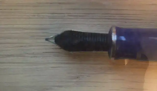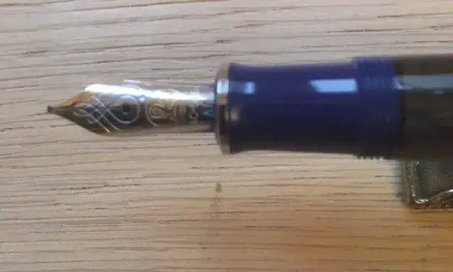 Lleva un plumín de 14 k punto M que fue modificado a itálico F/M por una nibmaster inglesa cuyo nombre real no recuerdo (se hacía llamar hippycat). Es un itálico que tira a fino, con muy buena variación de línea y que vale para uso diario y para firmas por igual.