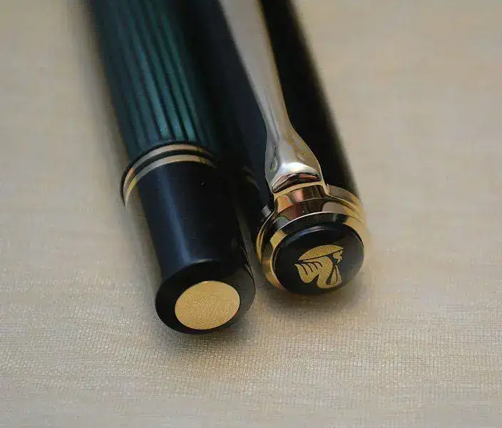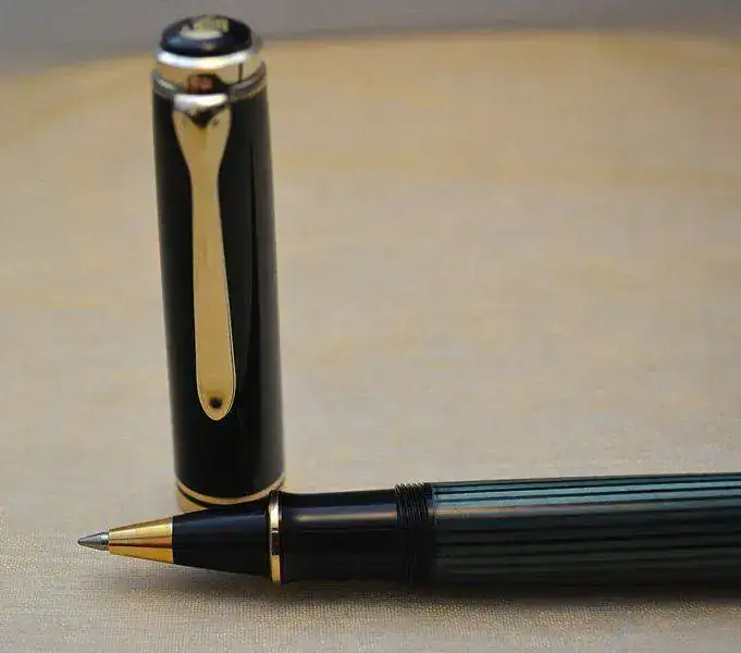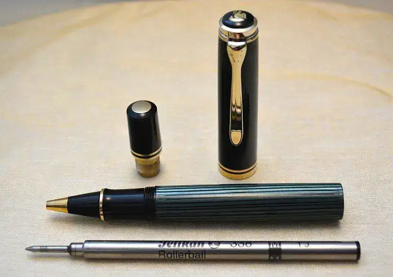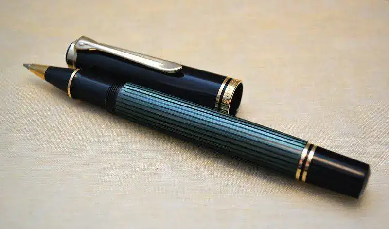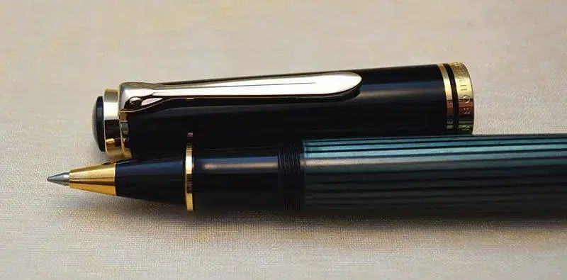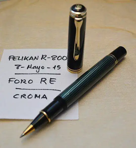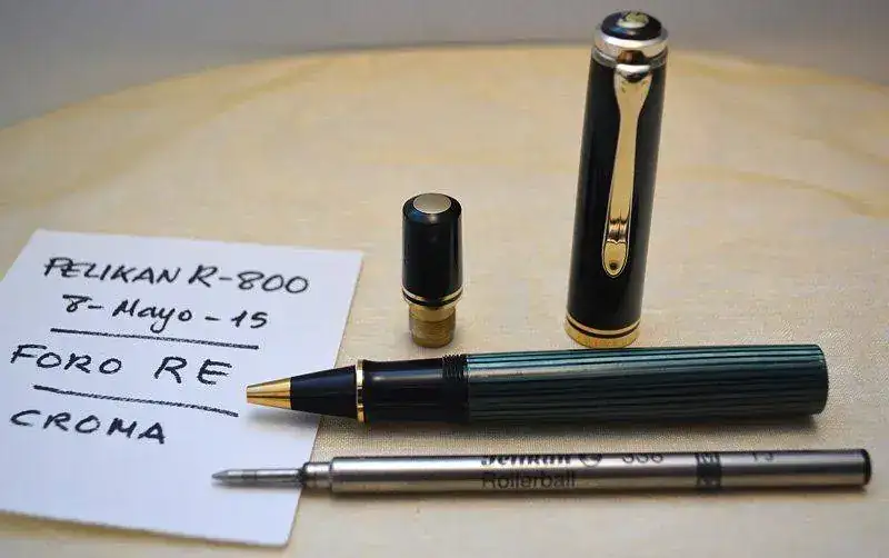 Ofrezco para su venta este Roller PELIKAN R800 en resina negra, celuloide verde rayado y con acabados de los detalles de metal chapados en oro.