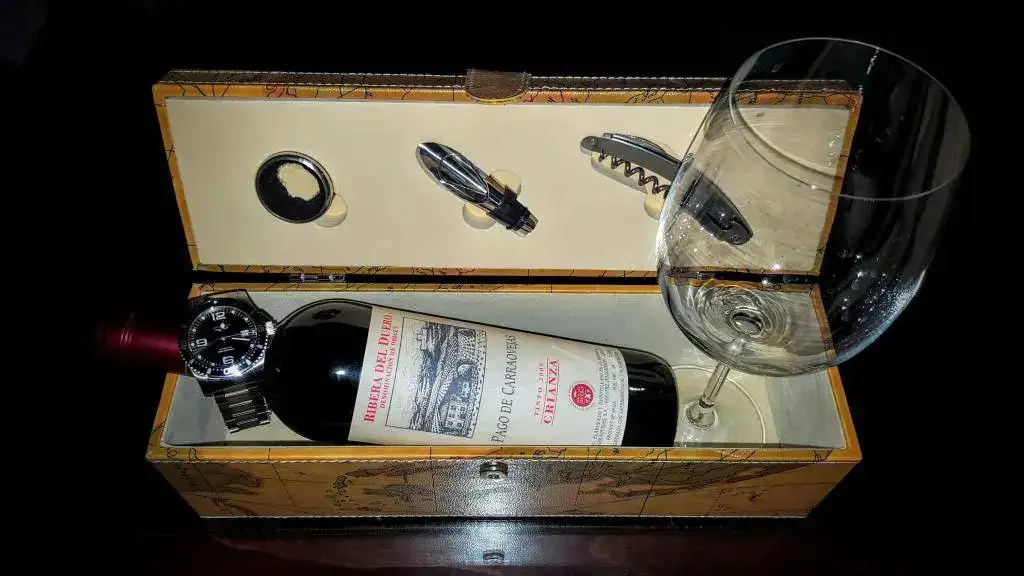 El reloj no está mal, aunque se lo ve un poco roñoso. El vino, una puta mierda si lo que se pretende es presumir de estilo y clase como parece que es la intención de este ascazo de hilo.