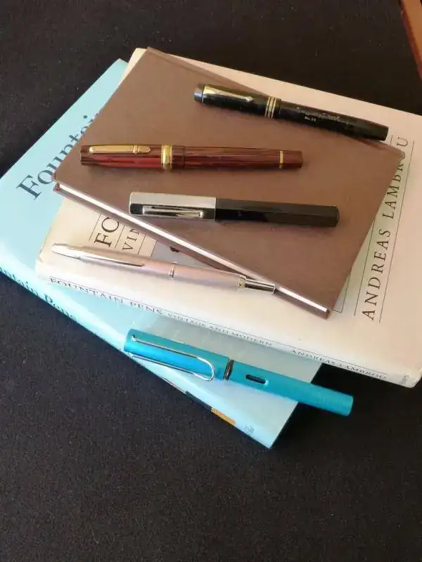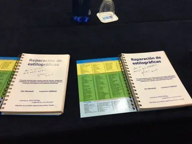 Finalmente, mostraros mis compras. No son muy abultadas, pero tenía el firme propósito de ceñirme a un presupuesto y lista de deseos razonable. En primer lugar, el libro de reparaciones de estilográficas traducido al castellano por Ariel Zuñiga. Aproveché que el autor estaba en la sala para pedirle una dedicatoria: