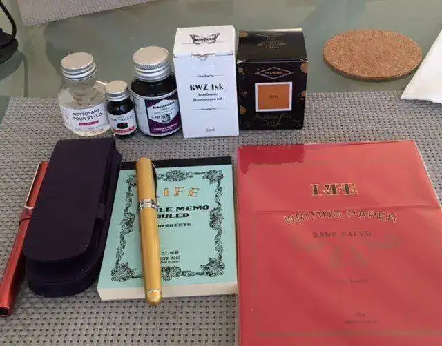 Un bote de limpiador, un bote mini de J. Herbin muy cuki, otro tintero de RK, un tintero de KWZ color "Monarch", aún sin estrenar, un marrón anaranjado muy chulo, un bote de Diamine Sepia, un roller Lamy Al-Star para mi marido, un estuche violeta, aunque sale muy oscuro en la foto es más clarito, una pluma amarilla Bulow con un señor plumín, regalo de Stephen Brown, un block pequeño Life y otro de papel de cartas, también Life.