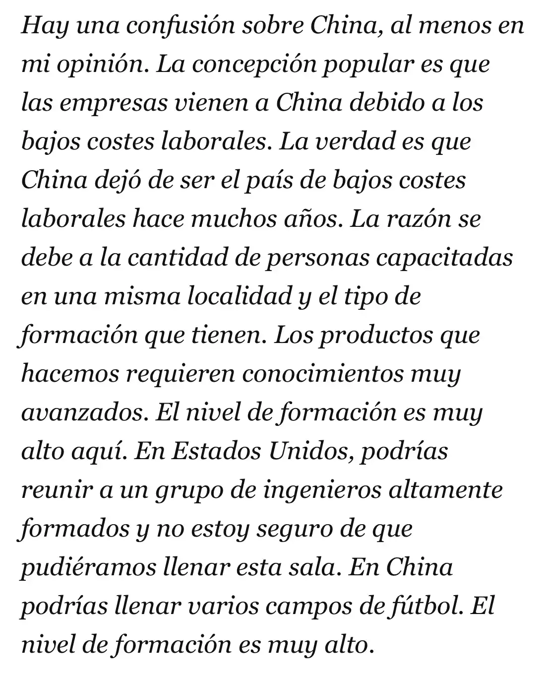 Uno que conocí en un grupo de relojes y que tiene varias fábricas (no de relojes sino de instrumental médico y telefonía) me comentó que también otra razón para estar en China es lo barata que es la automatización. Montar una planta de producción totalmente automatizada era muchísimo más barato en China que en Europa o Estados Unidos. Son expertos en ello. Pero vamos, la fuente es "me lo ha dicho uno". No veo que sea un invento pero desde luego reconozco que no es la mejor fuente 😆Si hacemos caso al CEO de Apple da la sensación de que si China quiere le puede complicar la vida a cualquiera